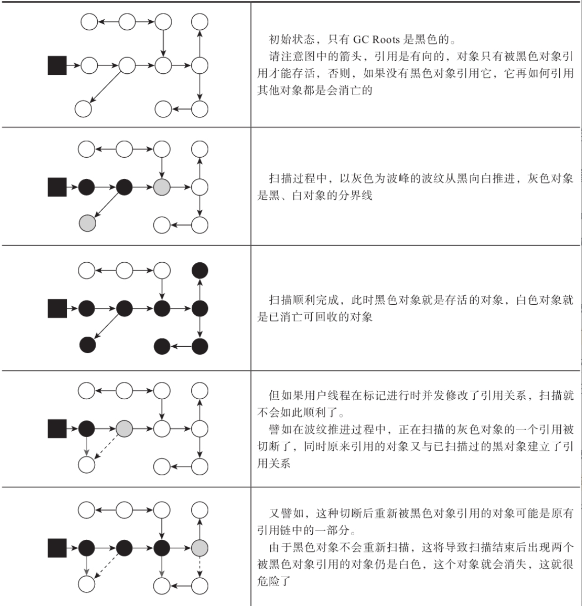 当用户线程与垃圾回收器是并行工作的时候,就会产生问题。一种是把原本消亡的对象错误标记为存活,另一种是把原本存活的对象错误标记为已消亡。