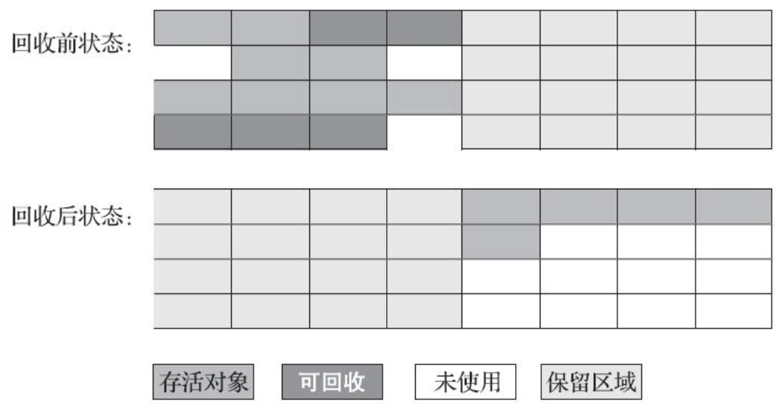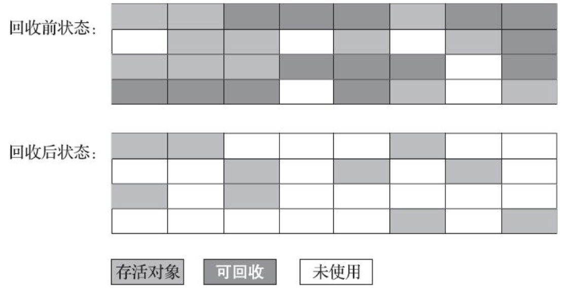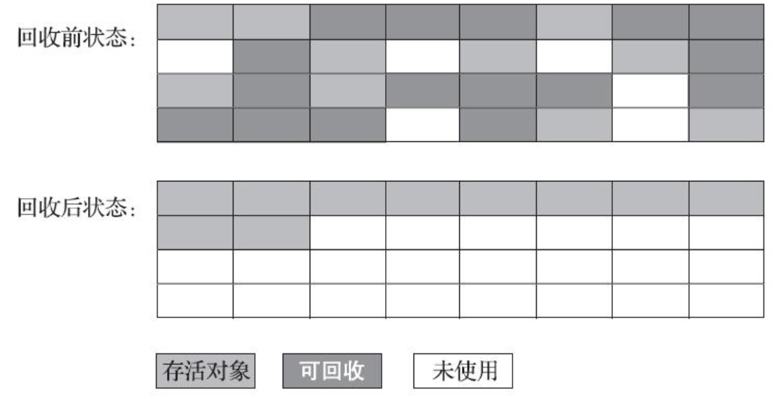 标记过程和标记-清除算法是一样的,但后续步骤不是直接对可回收对象进行清理,而是让所有存活的对象都向内存空间一端移动,然后直接清理掉边界以外的内存。两阶段操作也是STW的