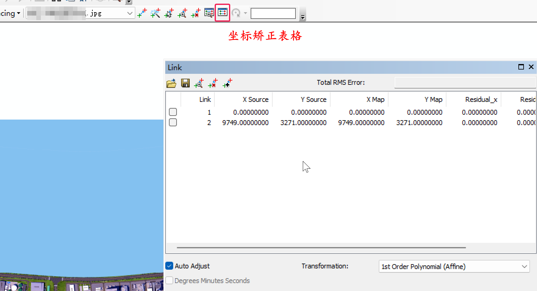 在地图配准工具中选择 查看链接列表(View Link Table)工具,进行坐标转换