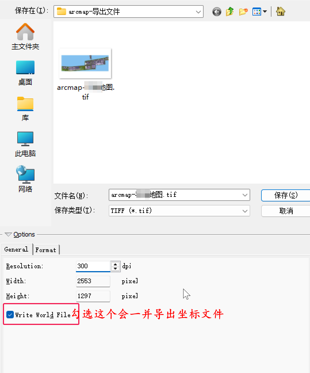 导出文件,选择File-Export Map 在导出框中选择tif并勾选Write World File 附带坐标文件,注意Resolution越高质量就越大,图片就越清晰,选择合适(800左右dpi)的即可。