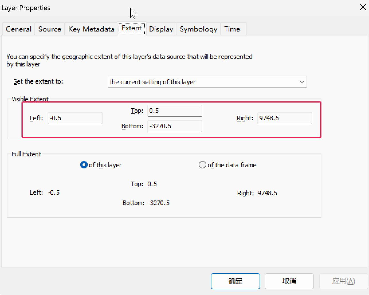 右击图片查看属性、选择Extent查看里面的图片尺寸(注:需要把点位坐标实际的值加上0.5,即:0,0左上角)可以看到右下角的坐标是(9749,3271)