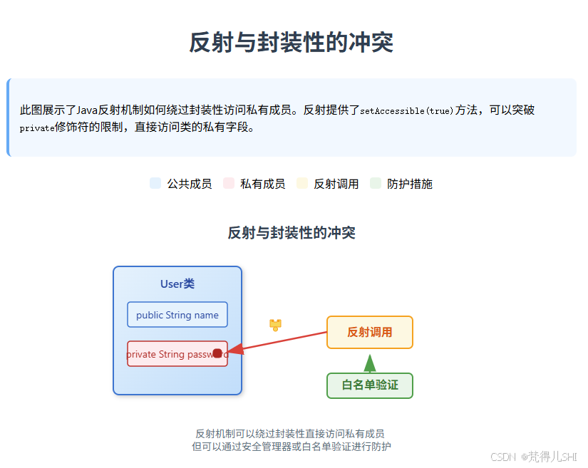public class ReflectBreakEncapsulation {public static void main(String[] args) throws NoSuchFieldException, IllegalAccessException {User user = new User();Field passwordField = User.class.getDeclaredField("password");passwordField.setAccessible(true); // 关闭访问检查String password = (String) passwordField.get(user);System.out.println("获取私有密码:" + password); // 输出:secret}