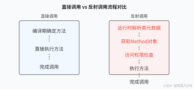 下图直观展示了直接调用与反射调用的流程差异,红色部分为反射额外的性能开销: