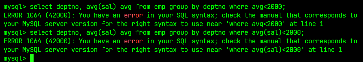 mysql> select deptno, avg(sal) avg from emp group by deptno having avg<2000;