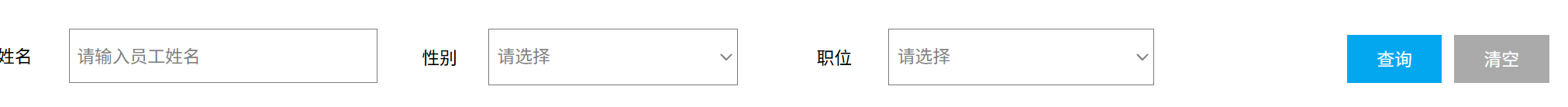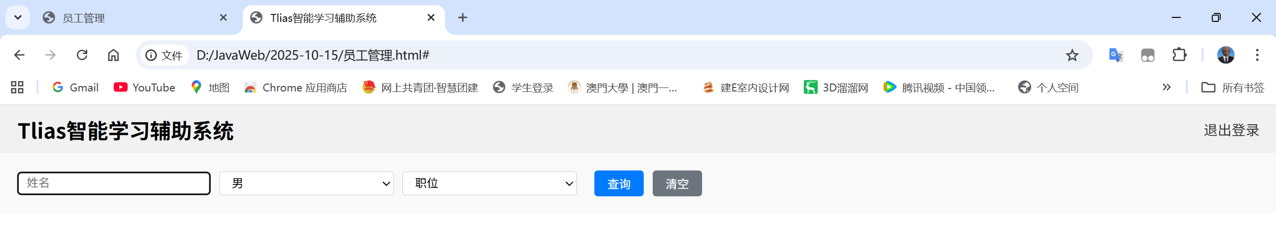 <body><!-- 顶栏 --><div class="header"><h1>Tlias智能学习辅助系统</h1><a href="#">退出登录</a></div><!-- 搜索表单区域 --><form class="search-form"><input type="text" name="name" placeholder="姓名" /><select name="gender"><option value="">性别</option><option value="1">男</option><option value="2">女</option></select><select name="job"><option value="">职位</option><option value="1">班主任</option><option value="2">讲师</option><option value="3">学工主管</option><option value="4">教研主管</option><option value="5">咨询师</option></select><button type="submit">查询</button><button type="reset" class="clear">清空</button></form></body>
