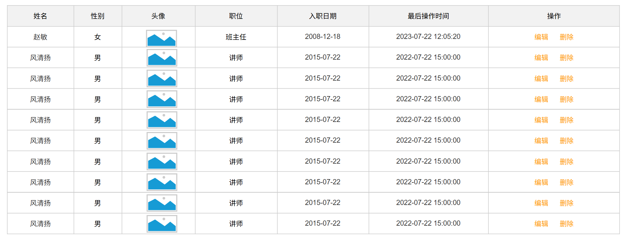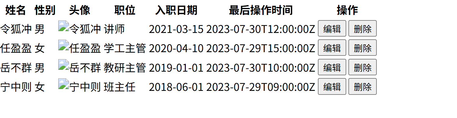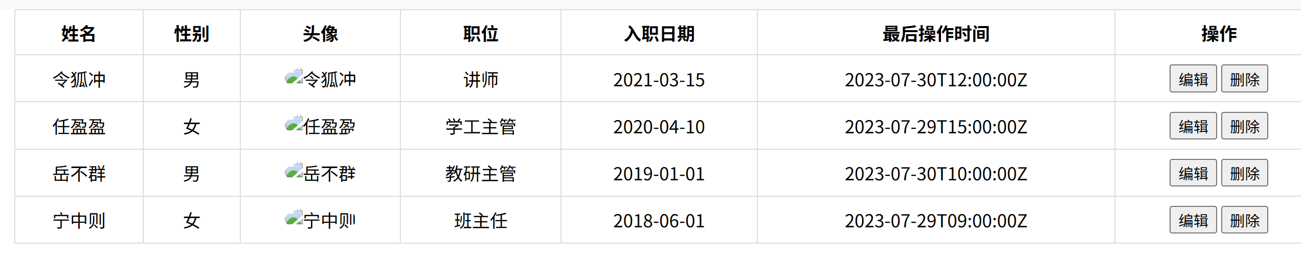 <table class="table table-striped table-bordered"><thead><tr><th>姓名</th><th>性别</th><th>头像</th><th>职位</th><th>入职日期</th><th>最后操作时间</th><th>操作</th></tr></thead><tbody><tr><td>令狐冲</td><td>男</td><td><img src="https://via.placeholder.com/50" alt="令狐冲" class="avatar"></td><td>讲师</td><td>2021-03-15</td><td>2023-07-30T12:00:00Z</td><td class="btn-group"><button>编辑</button><button>删除</button></td></tr><tr><td>任盈盈</td><td>女</td><td><img src="https://via.placeholder.com/50" alt="任盈盈" class="avatar"></td><td>学工主管</td><td>2020-04-10</td><td>2023-07-29T15:00:00Z</td><td class="btn-group"><button>编辑</button><button>删除</button></td></tr><tr><td>岳不群</td><td>男</td><td><img src="https://via.placeholder.com/50" alt="岳不群" class="avatar"></td><td>教研主管</td><td>2019-01-01</td><td>2023-07-30T10:00:00Z</td><td class="btn-group"><button>编辑</button><button>删除</button></td></tr><tr><td>宁中则</td><td>女</td><td><img src="https://via.placeholder.com/50" alt="宁中则" class="avatar"></td><td>班主任</td><td>2018-06-01</td><td>2023-07-29T09:00:00Z</td><td class="btn-group"><button>编辑</button><button>删除</button></td></tr></tbody></table>