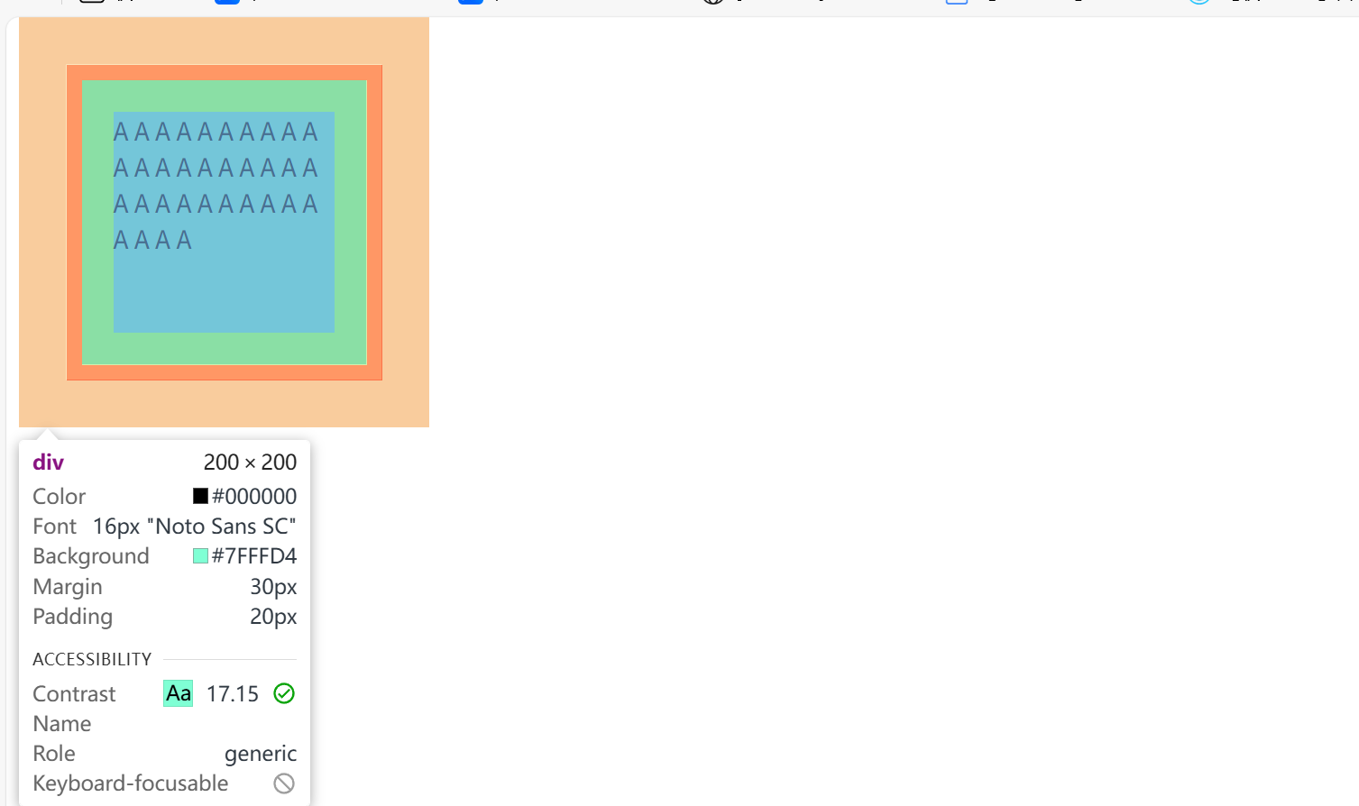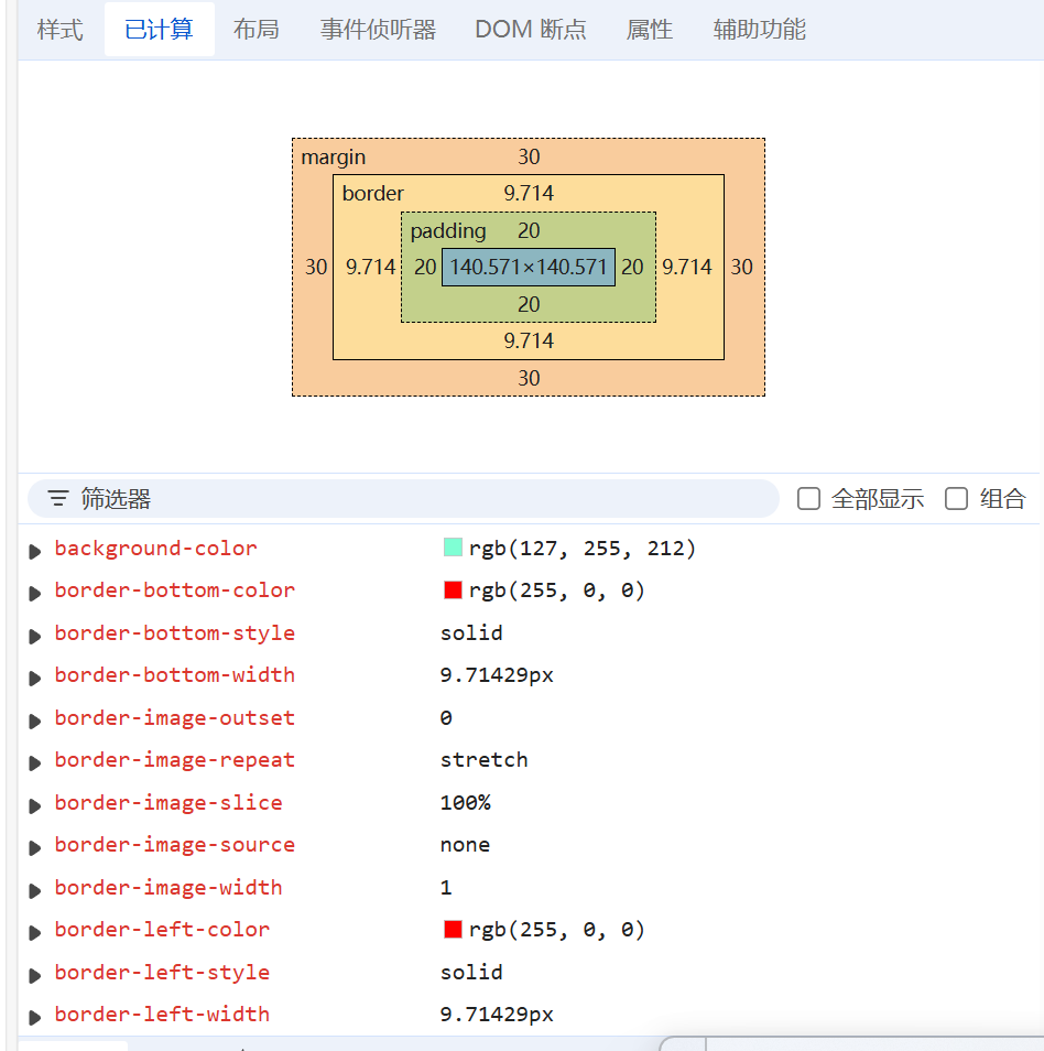 <head><meta charset="UTF-8"><meta http-equiv="X-UA-Compatible" content="IE=edge"><meta name="viewport" content="width=device-width, initial-scale=1.0"><title>盒子模型</title><style>div {width: 200px; /* 宽度 */height: 200px; /* 高度 */box-sizing: border-box; /* 指定width height为盒子的高宽 */background-color: aquamarine; /* 背景色 */padding: 20px 20px 20px 20px; /* 内边距, 上 右 下 左 , 边距都一行, 可以简写: padding: 20px;*/ border: 10px solid red; /* 边框, 宽度 线条类型 颜色 */margin: 30px 30px 30px 30px; /* 外边距, 上 右 下 左 , 边距都一行, 可以简写: margin: 30px; */}</style>