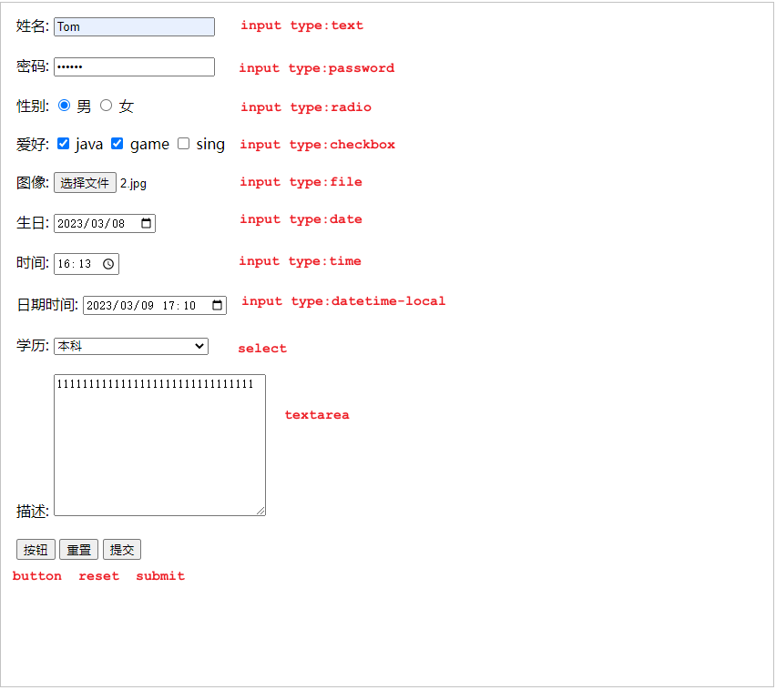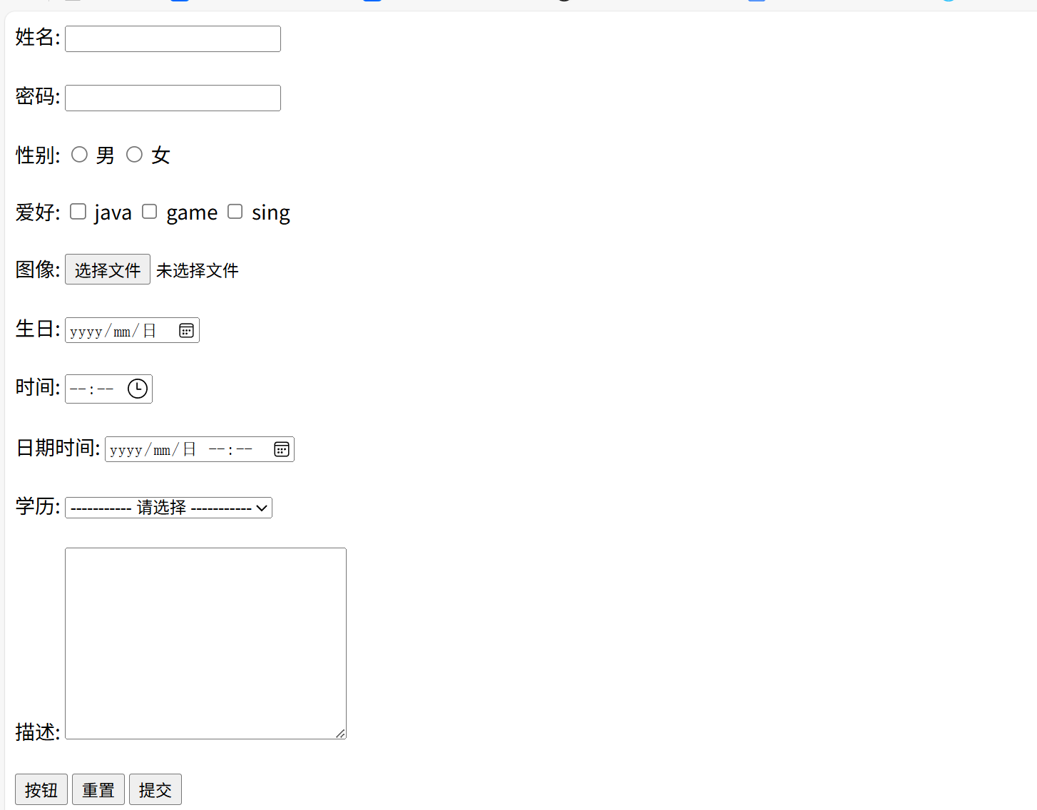 <form action="/save" method="post">姓名: <input type="text" name="name"> <br><br>密码: <input type="password" name="password"> <br><br> 性别: <input type="radio" name="gender" value="1"> 男<label><input type="radio" name="gender" value="2"> 女 </label> <br><br>爱好: <label><input type="checkbox" name="hobby" value="java"> java </label><label><input type="checkbox" name="hobby" value="game"> game </label><label><input type="checkbox" name="hobby" value="sing"> sing </label> <br><br>图像: <input type="file" name="image"> <br><br>生日: <input type="date" name="birthday"> <br><br>时间: <input type="time" name="time"> <br><br>日期时间: <input type="datetime-local" name="datetime"> <br><br>学历: <select name="degree"><option value="">----------- 请选择 -----------</option><option value="1">大专</option><option value="2">本科</option><option value="3">硕士</option><option value="4">博士</option></select> <br><br>描述: <textarea name="description" cols="30" rows="10"></textarea> <br><br><input type="hidden" name="id" value="1"><!-- 表单常见按钮 --><input type="button" value="按钮"><input type="reset" value="重置"> <input type="submit" value="提交"> <br>