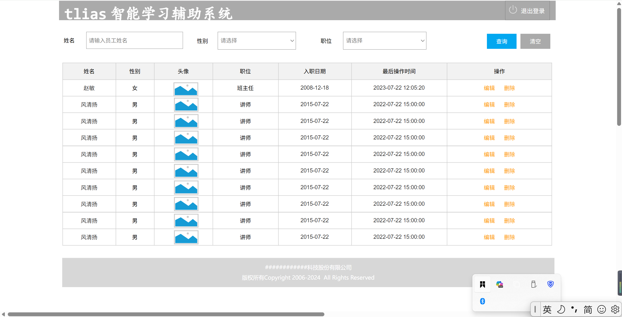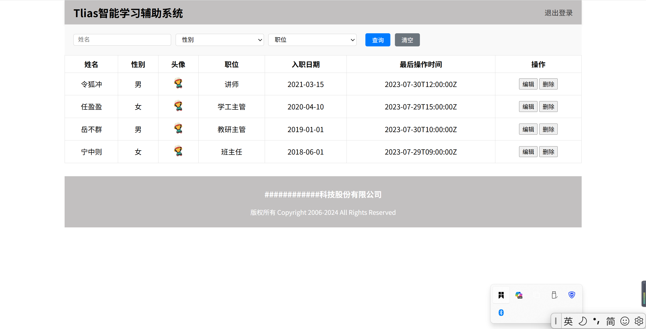 <body><div id="container"><!-- 顶栏 --><div class="header"><h1>Tlias智能学习辅助系统</h1><a href="#">退出登录</a></div><!-- 搜索表单区域 --><form class="search-form" action="#" method="post"><input type="text" name="name" placeholder="姓名" /><select name="gender"><option value="">性别</option><option value="male">男</option><option value="female">女</option></select><select name="position"><option value="">职位</option><option value="班主任">班主任</option><option value="讲师">讲师</option><option value="学工主管">学工主管</option><option value="教研主管">教研主管</option><option value="咨询师">咨询师</option></select><button type="submit">查询</button><button type="reset" class="clear">清空</button></form><table class="table table-striped table-bordered"><thead><tr><th>姓名</th><th>性别</th><th>头像</th><th>职位</th><th>入职日期</th><th>最后操作时间</th><th>操作</th></tr></thead><tbody><tr><td>令狐冲</td><td>男</td><td><img src="https://web-framework.oss-cn-hangzhou.aliyuncs.com/2023/1.jpg" alt="令狐冲" class="avatar"></td><td>讲师</td><td>2021-03-15</td><td>2023-07-30T12:00:00Z</td><td class="btn-group"><button>编辑</button><button>删除</button></td></tr><tr><td>任盈盈</td><td>女</td><td><img src="https://web-framework.oss-cn-hangzhou.aliyuncs.com/2023/1.jpg" alt="任盈盈" class="avatar"></td><td>学工主管</td><td>2020-04-10</td><td>2023-07-29T15:00:00Z</td><td class="btn-group"><button>编辑</button><button>删除</button></td></tr><tr><td>岳不群</td><td>男</td><td><img src="https://web-framework.oss-cn-hangzhou.aliyuncs.com/2023/1.jpg" alt="岳不群" class="avatar"></td><td>教研主管</td><td>2019-01-01</td><td>2023-07-30T10:00:00Z</td><td class="btn-group"><button>编辑</button><button>删除</button></td></tr><tr><td>宁中则</td><td>女</td><td><img src="https://web-framework.oss-cn-hangzhou.aliyuncs.com/2023/1.jpg" alt="宁中则" class="avatar"></td><td>班主任</td><td>2018-06-01</td><td>2023-07-29T09:00:00Z</td><td class="btn-group"><button>编辑</button><button>删除</button></td></tr></tbody></table><!-- 页脚版权区域 --><footer class="footer"><p class="company-name">############科技股份有限公司</p><p class="copyright">版权所有 Copyright 2006-2024 All Rights Reserved</p></footer></div></body>