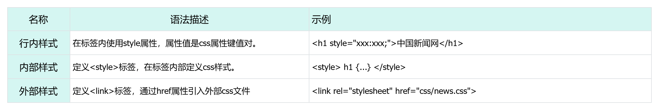 那在HTML的文件中,我们如何来编写CSS样式呢,此时就涉及到CSS的三种引入方式。具体有3种引入方式,语法如下表格所示:
