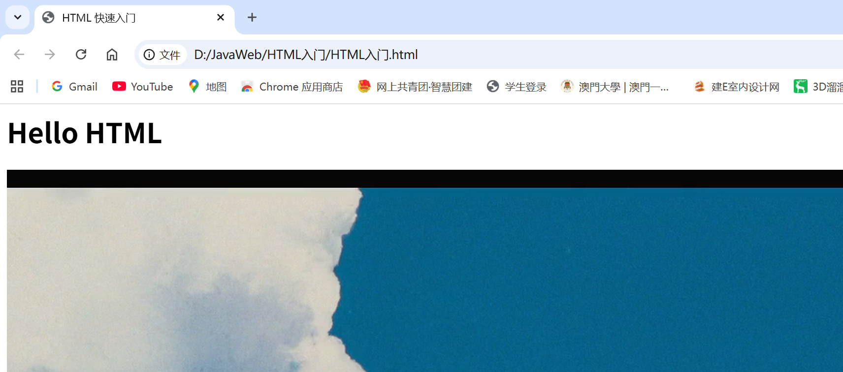 <html><head><title>HTML 快速入门</title></head><body><h1>Hello HTML</h1><img src="img/1.png"></body>