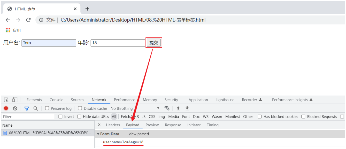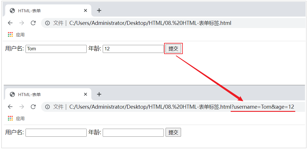 表单编写完毕之后,通过浏览器打开此表单,然后再表单项中录入值之后,点击提交,我们会看到表单的数据在url后面提交到服务端,格式为:?username=Tom&age=12。