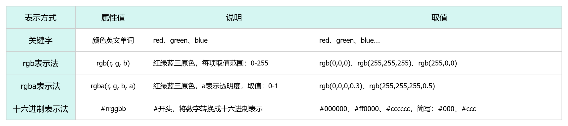在前端程序开发中,颜色的表示方式常见的有如下三种: