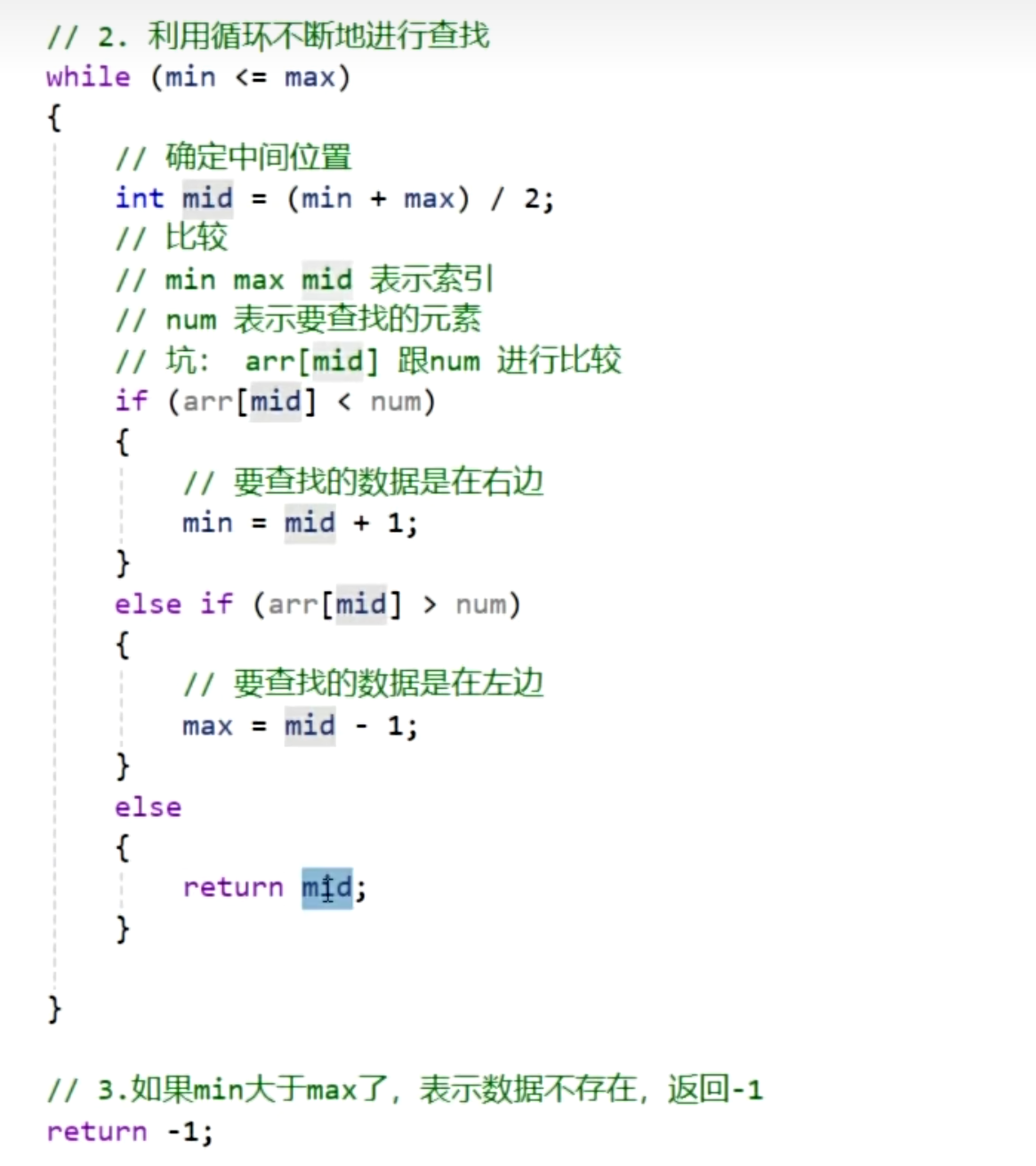 这是二分查找的算法,原理就是我们猜数字对半猜的原理,由于我们不知道到底要猜多少次,因此我们使用while循环,然后我们定义0号位为最小值,最右边的为最大值,定义中间的位置为中间值mid,通过mid与我们查找的值比较,mid大了就把max变成mid-1,然后改变mid继续比较,最后mid总会与num相同,这样我们就能实现查找num序号的功能,通过这个功能,我们可以实现万级数据的快速查找。