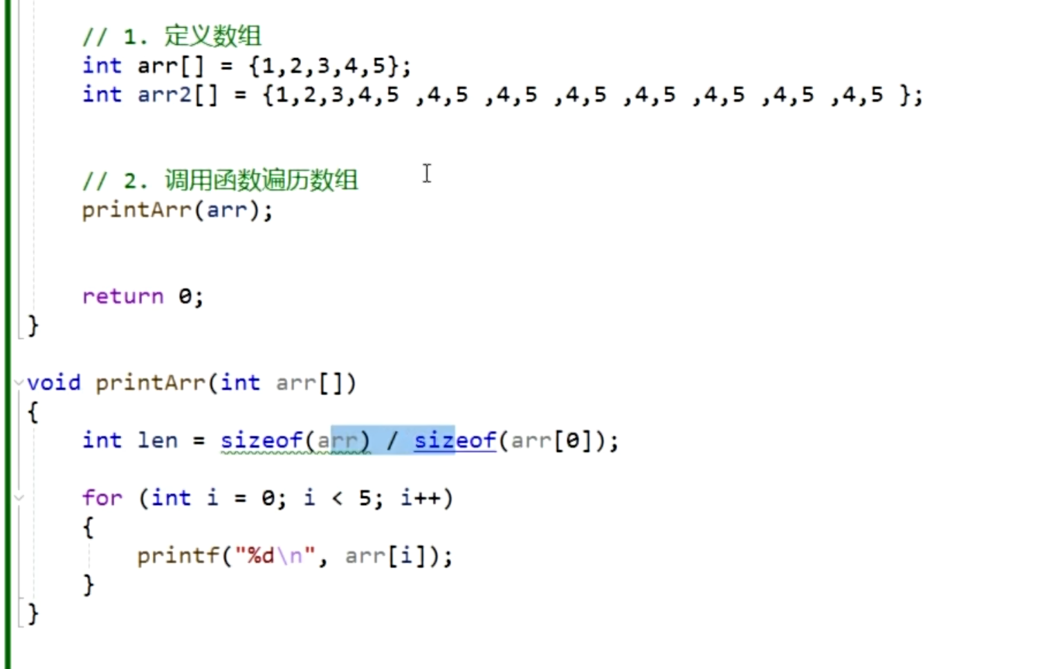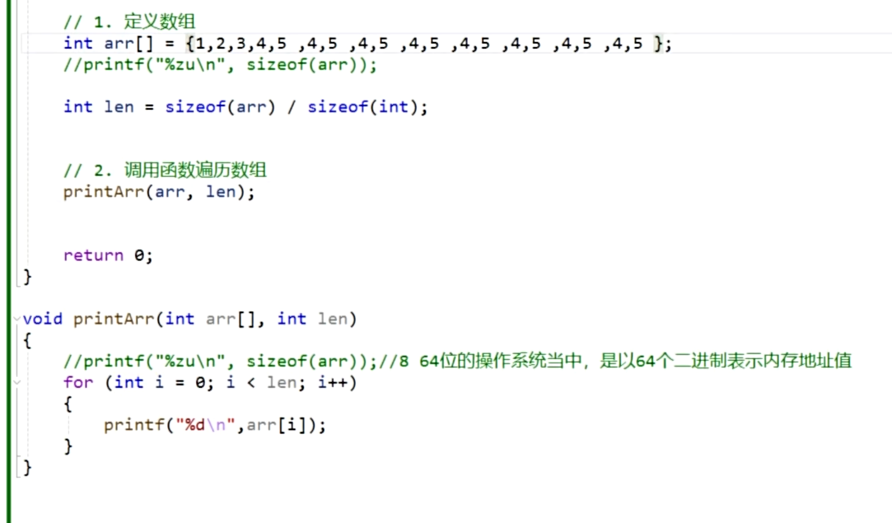 根据上面的点,我们可以知道,数组作为函数的参数进行传递,传递的只是函数的首地址,也就是最后在函数中用用int len=sizeof(数组)/sizeof(数组[0])