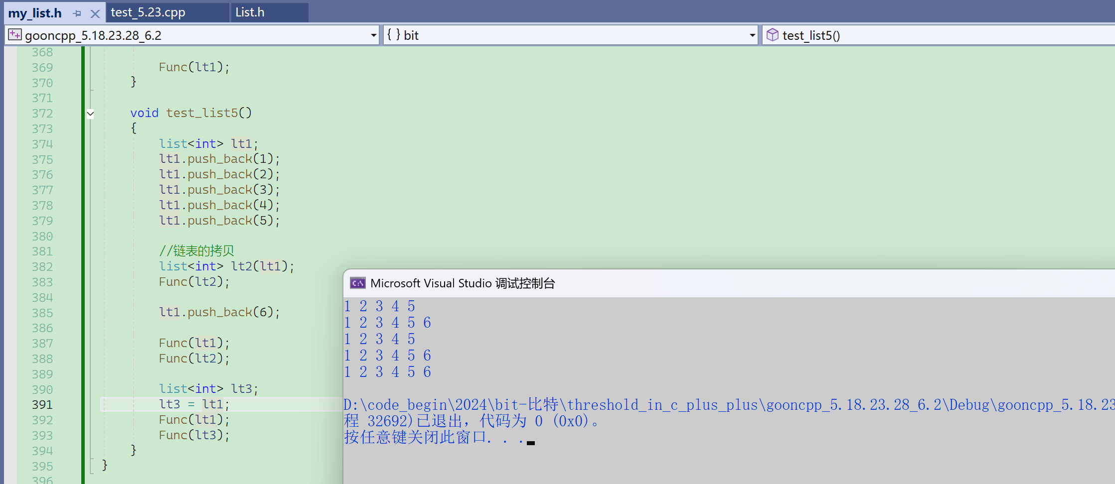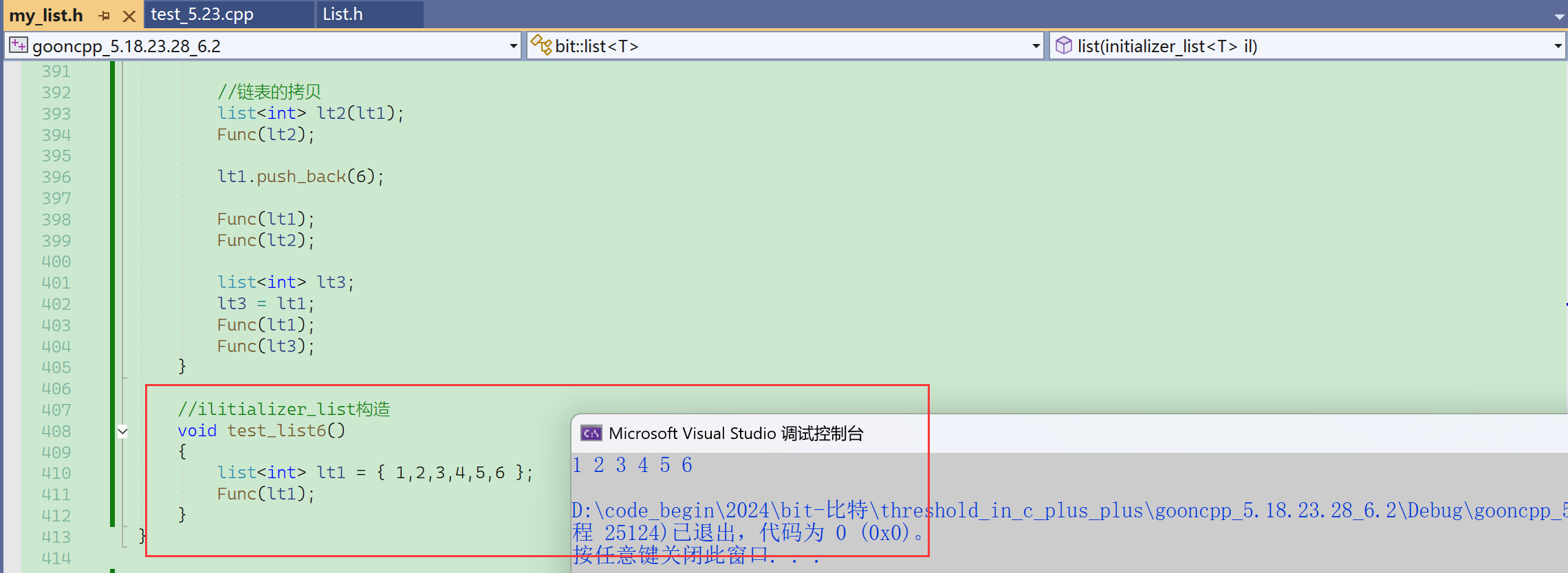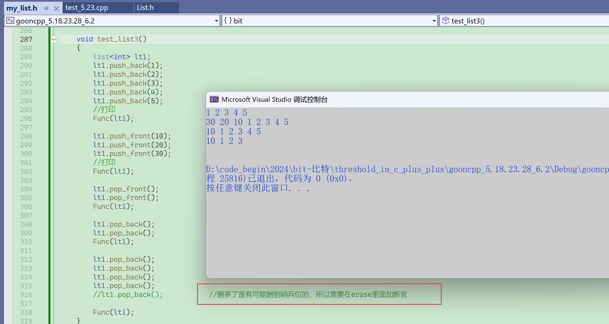 {int array[] = { 1, 2, 3, 4, 5, 6, 7, 8, 9, 0 };list<int> l(array, array+sizeof(array)/sizeof(array[0]));auto it = l.begin();while (it != l.end()){// erase()函数执行后,it所指向的节点已被删除,因此it无效,在下一次使用it时,必须先给