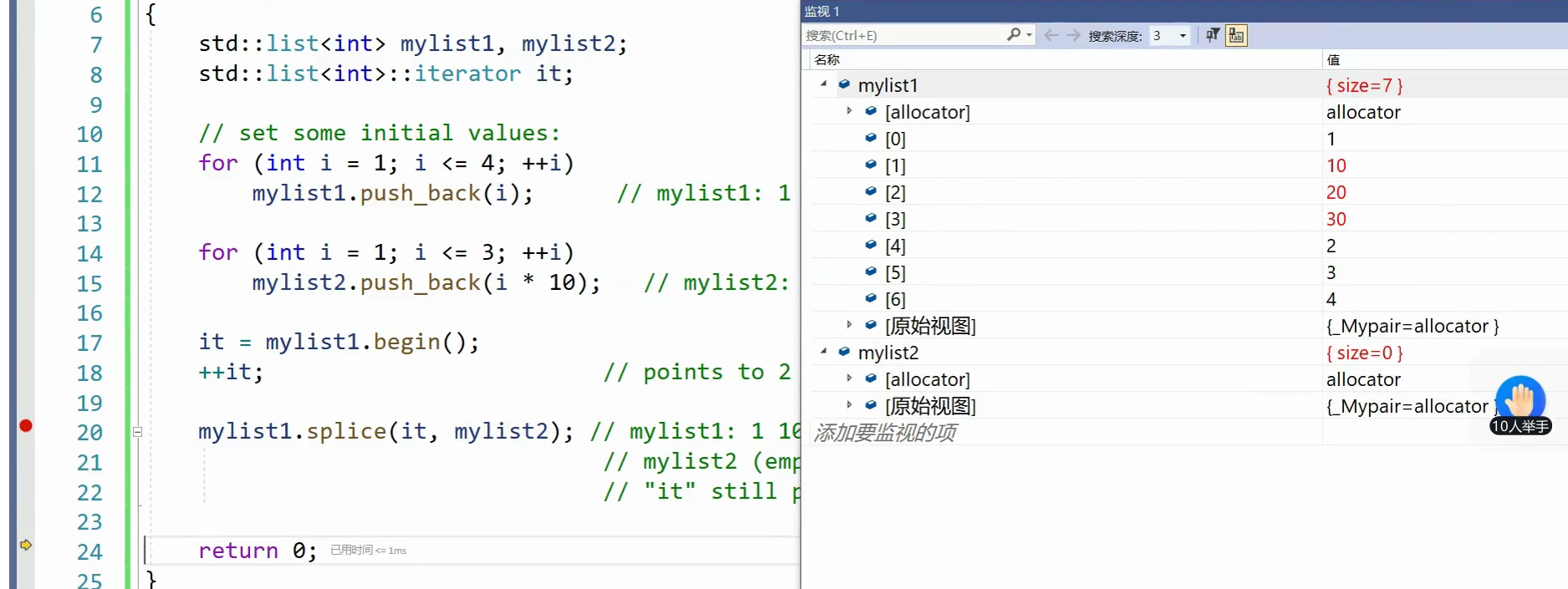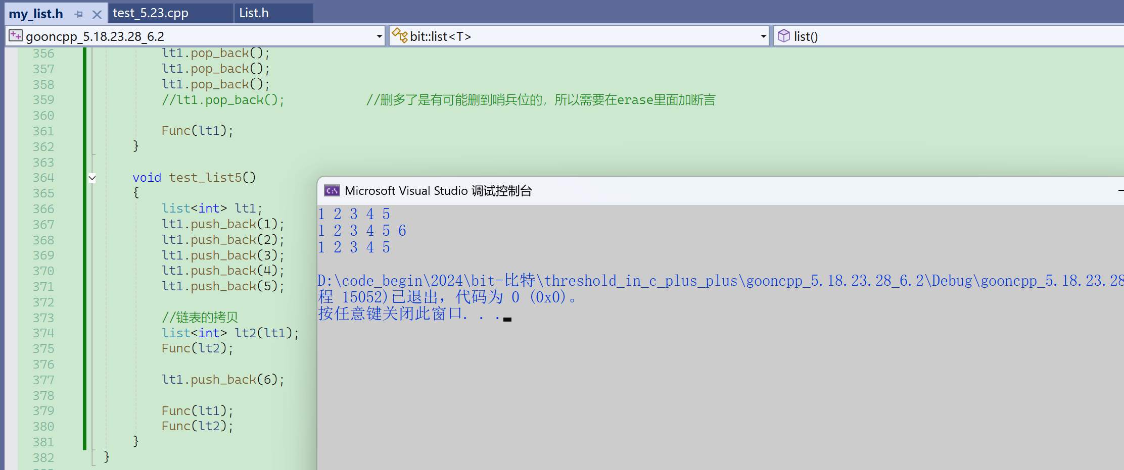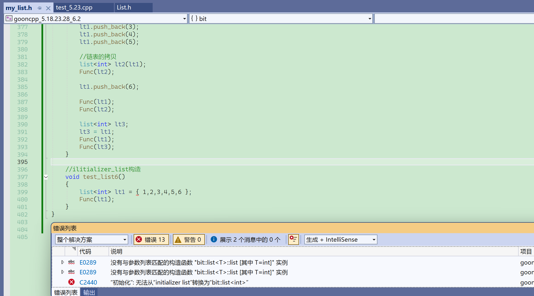 {int array[] = { 1, 2, 3, 4, 5, 6, 7, 8, 9, 0 };list<int> l(array, array+sizeof(array)/sizeof(array[0]));auto it = l.begin();while (it != l.end()){// erase()函数执行后,it所指向的节点已被删除,因此it无效,在下一次使用it时,必须先给