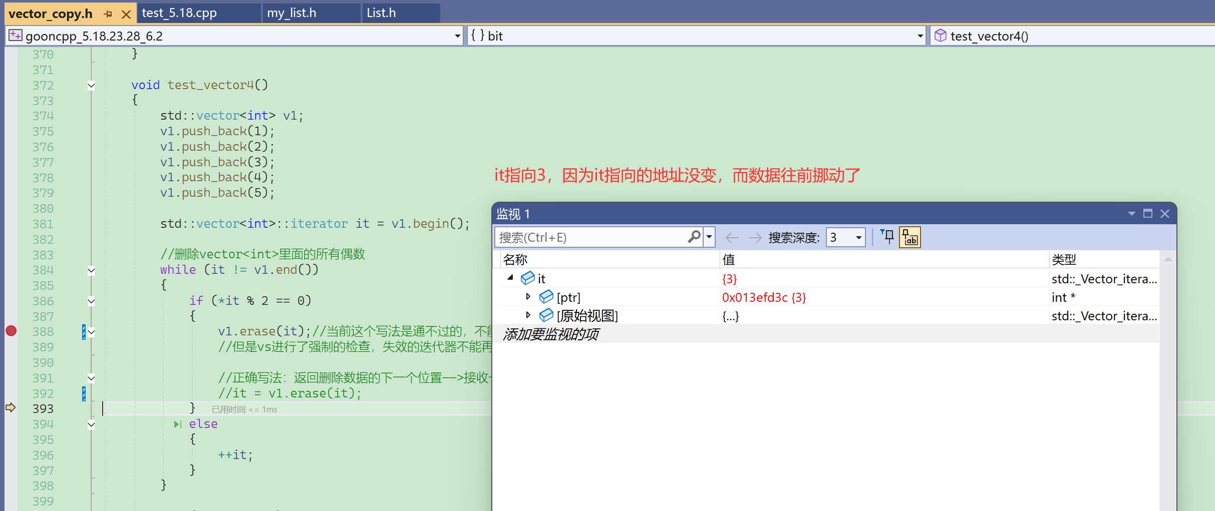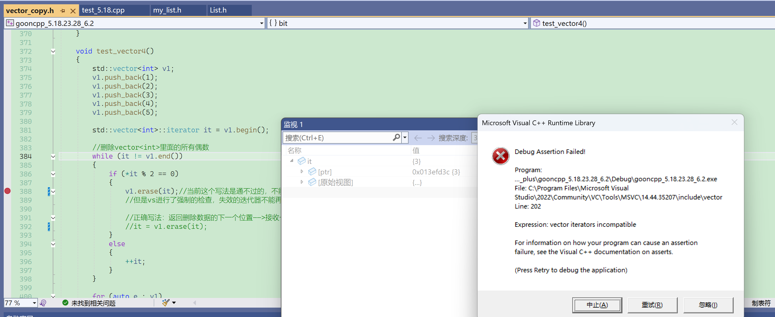 从398行跳到384行后,再按f10就出错了,因为it !=end()会调用迭代器的函数,而迭代器接收到失效的迭代器后,就会报错。
