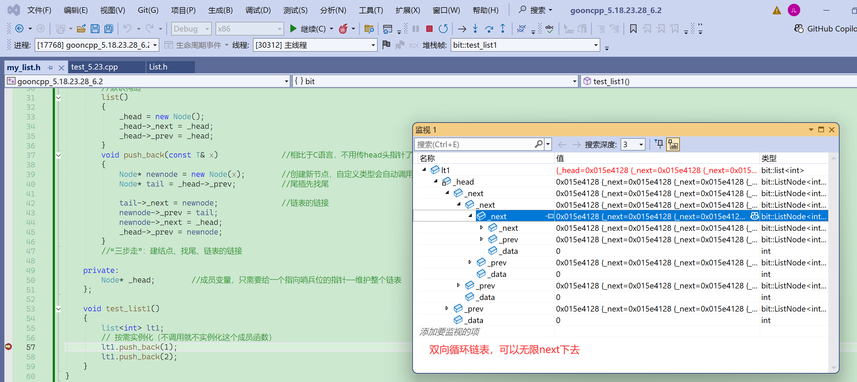 - 由于这里是双向带头循环链表,可以无限next下去,或无限prev下去。