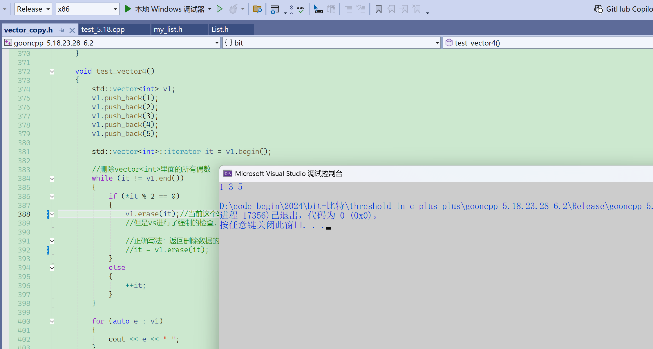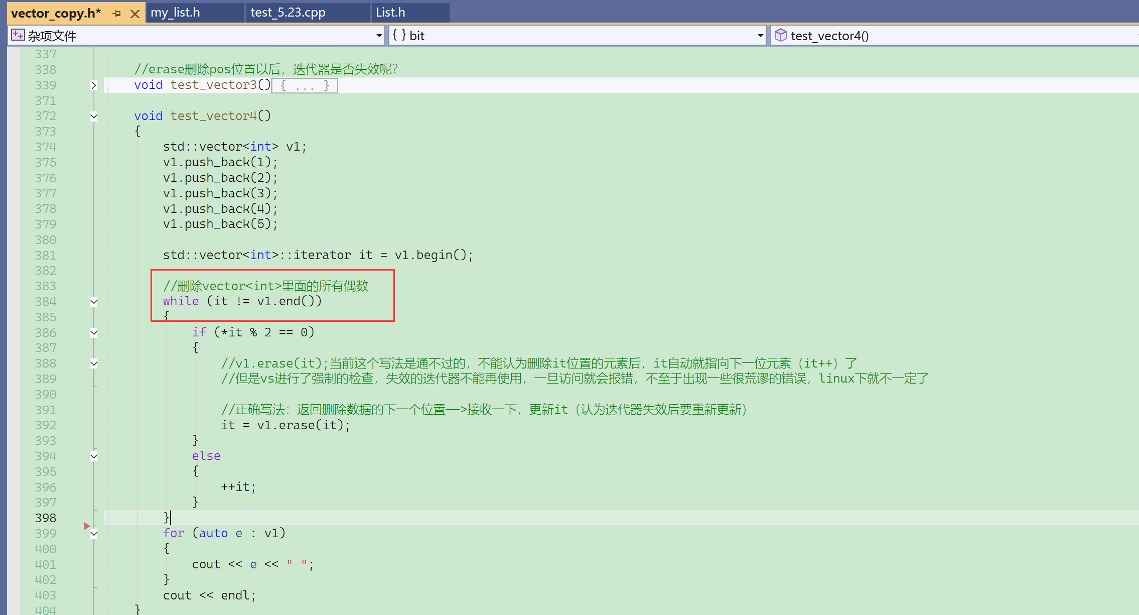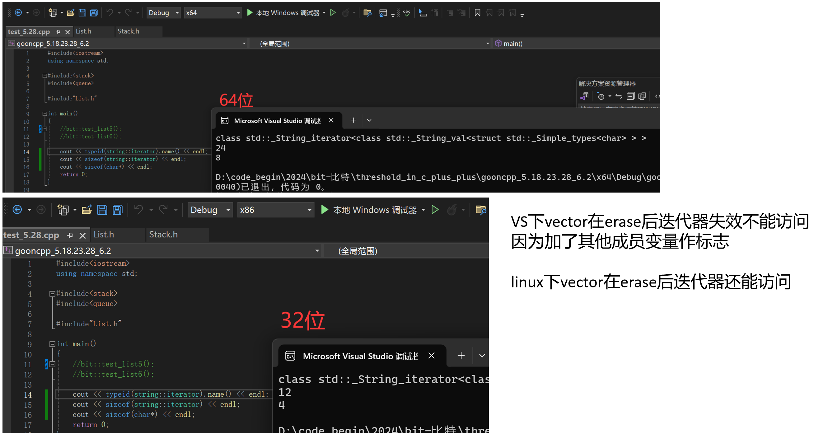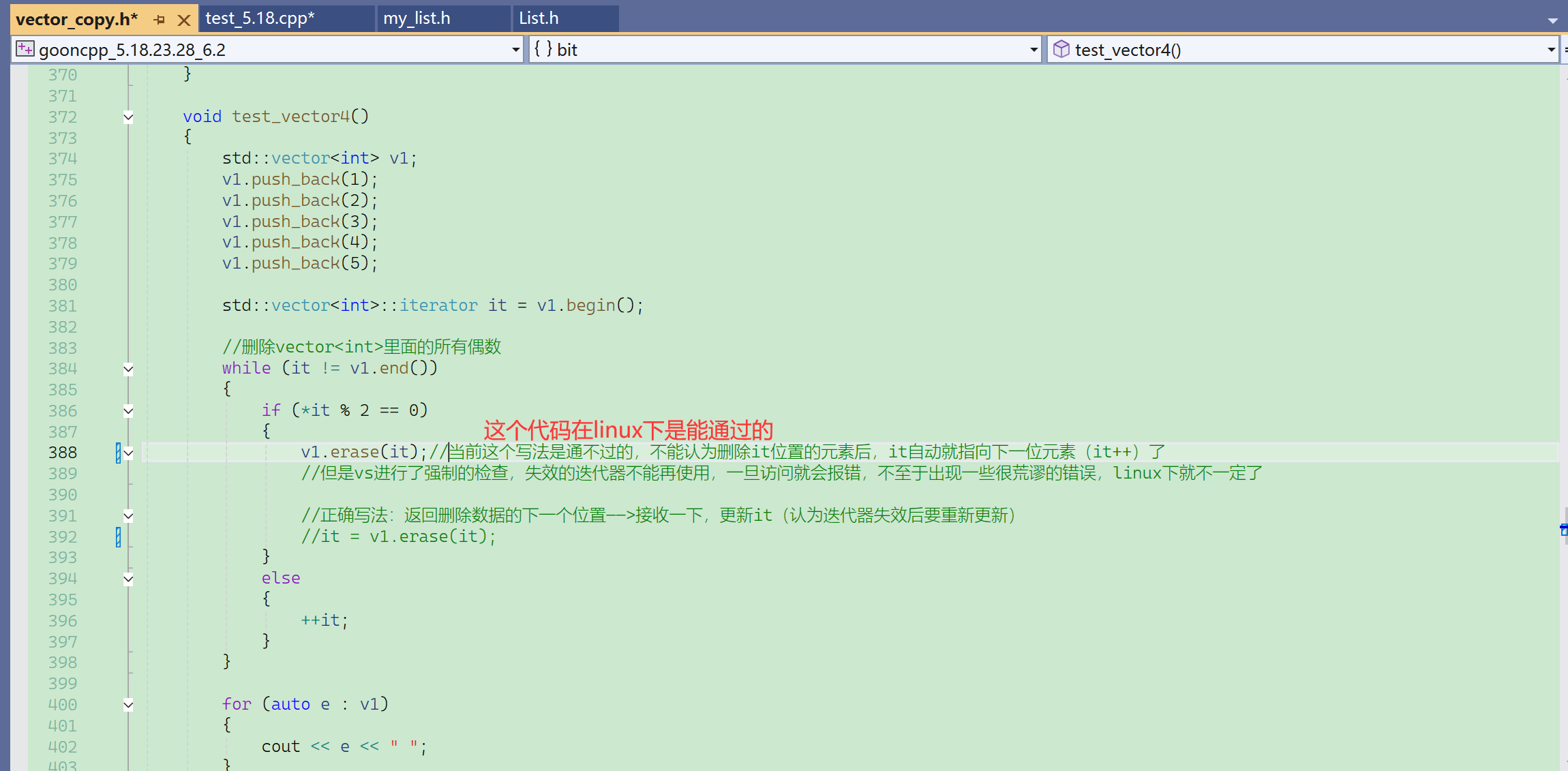 显然vector的迭代器设计这里,VS下的封装效果更好,避免了访问失效的迭代器的错误。这个代码在linux下能正常通过,但实际上有隐藏的bug没有检测出来。