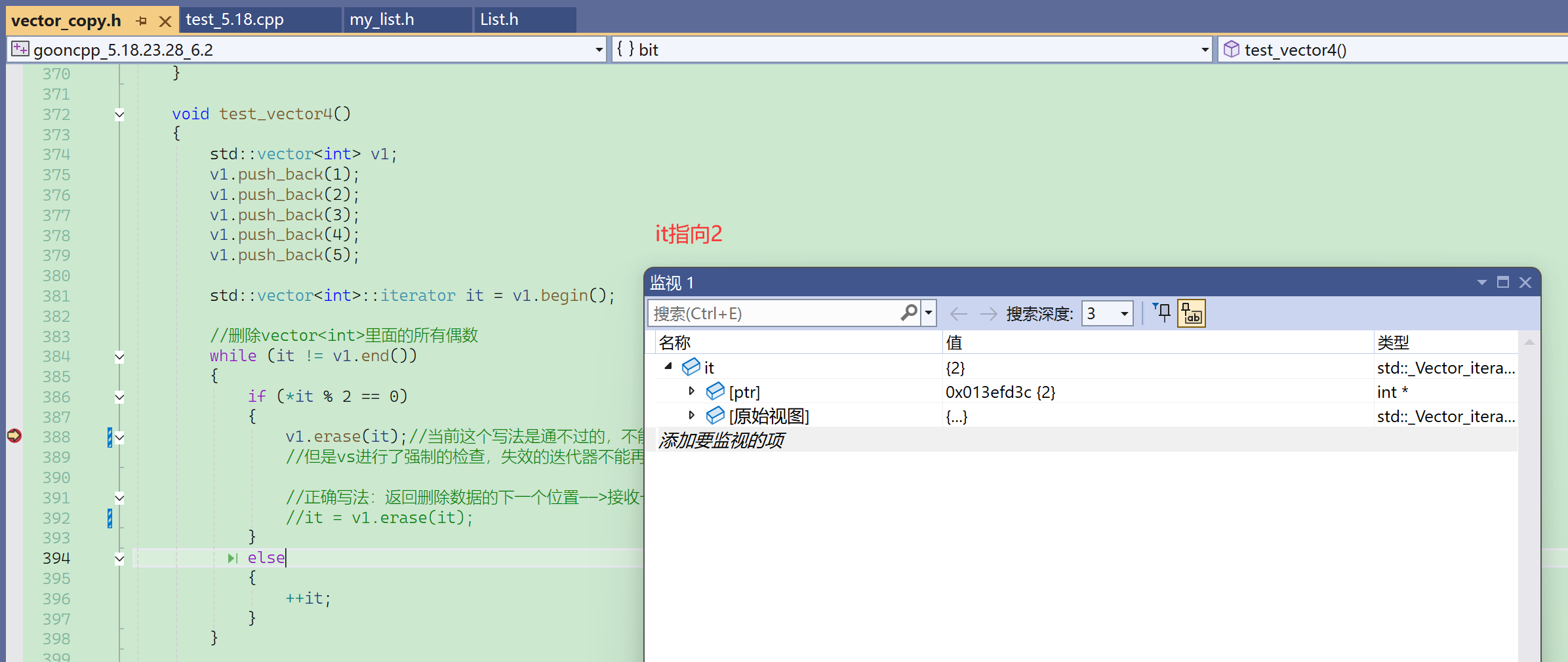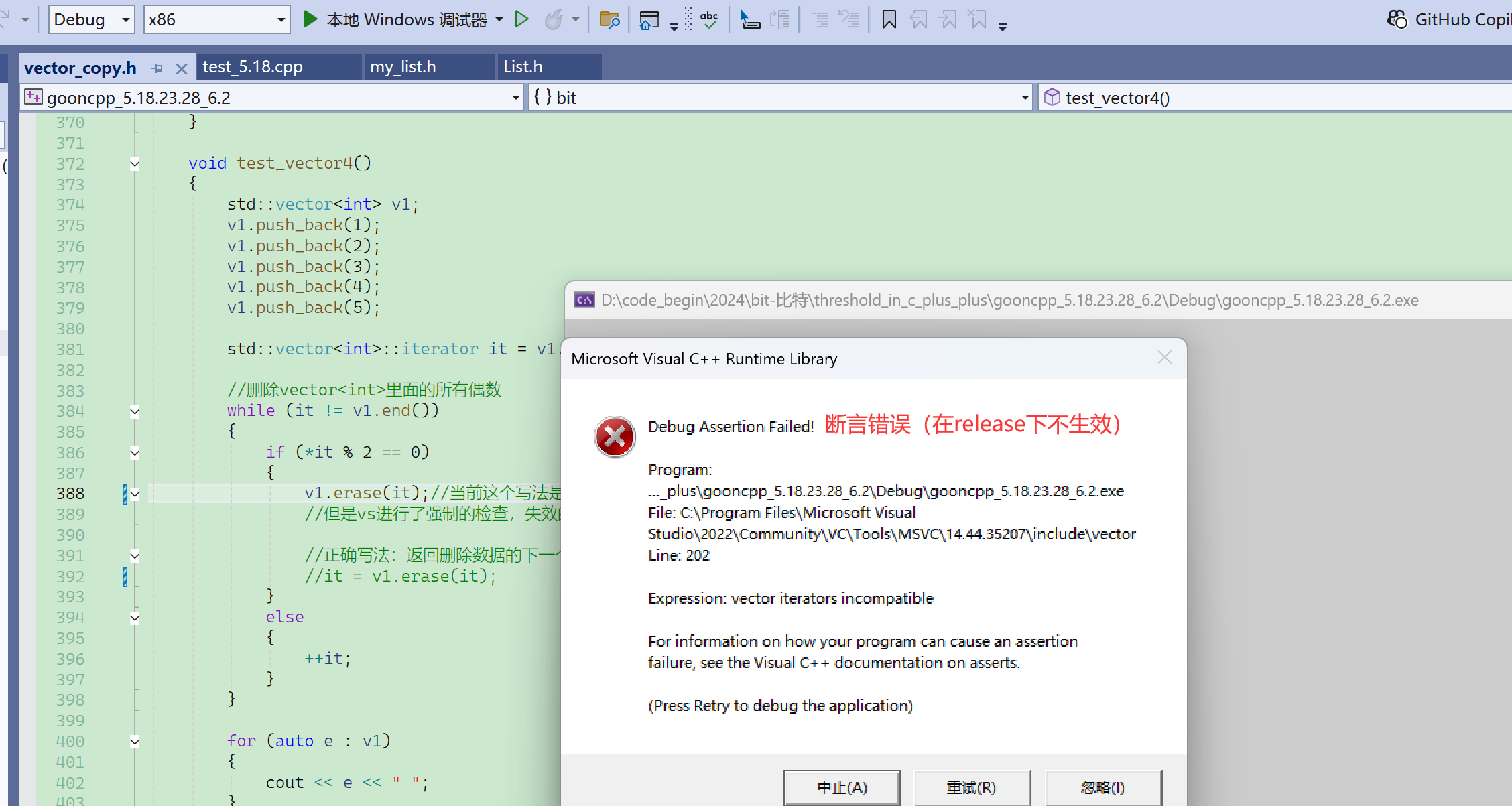 标志失效(false),再访问迭代器就会报断言错误。VS下的自定义类型封装原生指针,给出了更多更丰富的功能,一旦迭代器失效,就不允许再访问了,否则就报断言错误。
