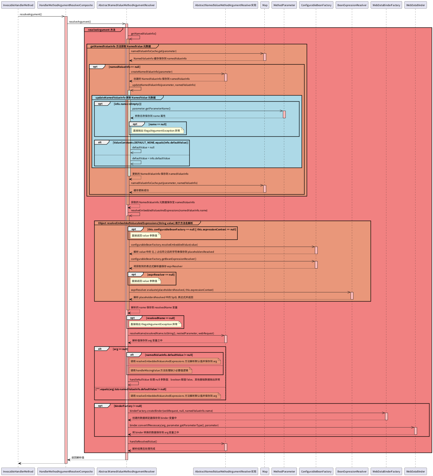 resolveArgument 方法首先调用 getNamedValueInfo 方法获取对应的 NamedValueInfo 对象,随后调用 parameter 参数的 nestedIfOptional 方法获取实际参数对象;并在之后调用 resolveEmbeddedValuesAndExpressions 方法解析参数名中占位符以及表达式,随后调用 resolveName 从指定位置处获取解析得到对应参数值并保存到 arg 变量之中,在未解析获取到任何值时且参数为必须时,直接调用 handleMissingValue 方法处理未查到参数异常,在其为空或空字符串且拥有默认值时,调用 resolveEmbeddedValuesAndExpressions 方法对默认值进行解析并更新到 arg 属性之中,否则在 arg 为 null 时调用 handleNullValue 方法对空参数值进行处理;随后使用 binderFactory 数据绑定工厂创建 WebDataBinder 数据绑定器对象并调用其 convertIfNecessary 方法将 arg 参数值转换为对应类型数据,最后调用 handleResolvedValue 方法进一步处理完成解析的参数并返回。