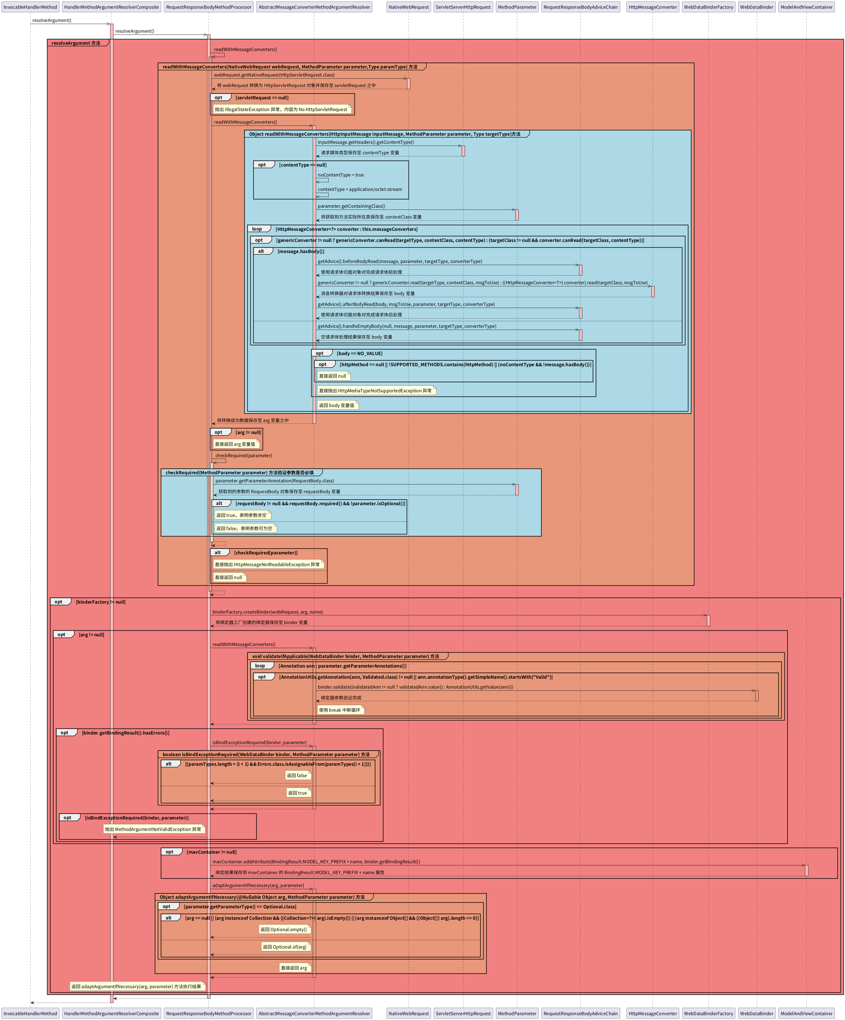 resolveArgument 方法首先通过 readWithMessageConverters 方法解析 webRequest 请求体并将解析结果保存到 arg 变量中并使用 Conventions 的 getVariableNameForParameter 生成参数对应的对象名;在 binderFactory 不为空时首先调用其 createBinder 方法创建对应数据绑定器,之后若 arg 解析参数不为空,依次调用 validateIfApplicable 与 isBindExceptionRequired 方法进行参数的验证,判断是否直接抛出异常,随后在 mavContainer 参数不为空时,直接将参数结果保存绑定到其 BindingResult.MODEL_KEY_PREFIX + name 属性上,最后调用 adaptArgumentIfNecessary 参数适配 Optional 参数。