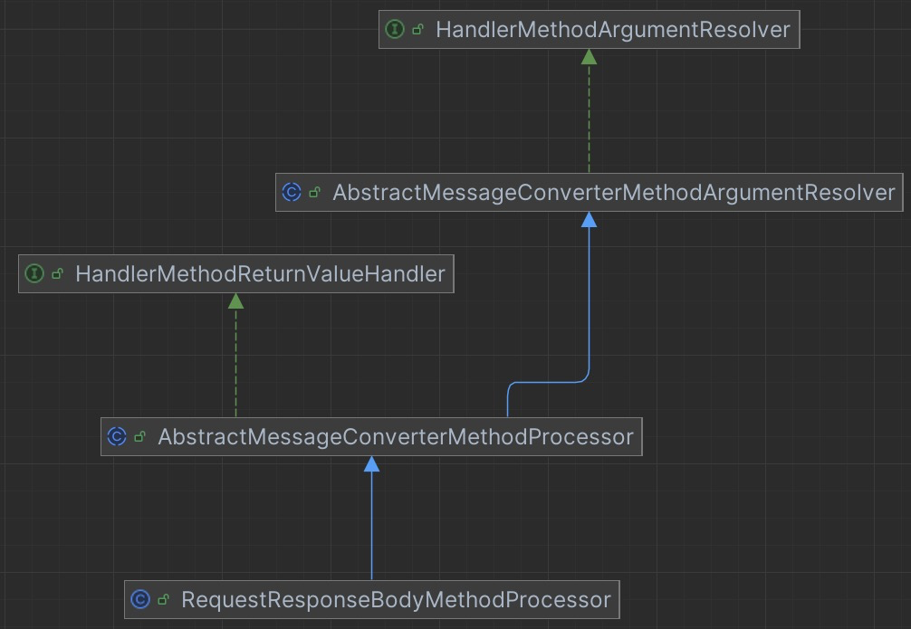 RequestResponseBodyMethodProcessor 类拥有两个功能,一个是对 RequestBody 请求参数进行解析,另一个则是处理 ResponseBody 响应结果;由于本文只是针对 HandlerMethodArgumentResolver 方法参数处理器的实现进行分析,因此只会对请求参数解析流程进行分析,对应返参处理流程的分析(AbstractMessageConverterMethodProcessor 中定义的方法及 handleReturnValue 相关方法)将会在后续 HandlerMethodReturnValueHandler 返回值处理器接口及其实现中进行;