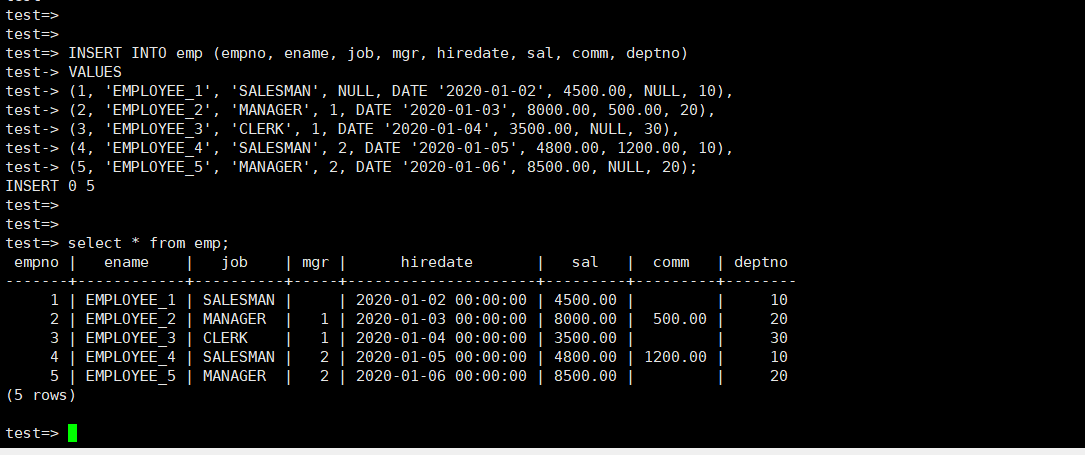 ksql -U system -d test