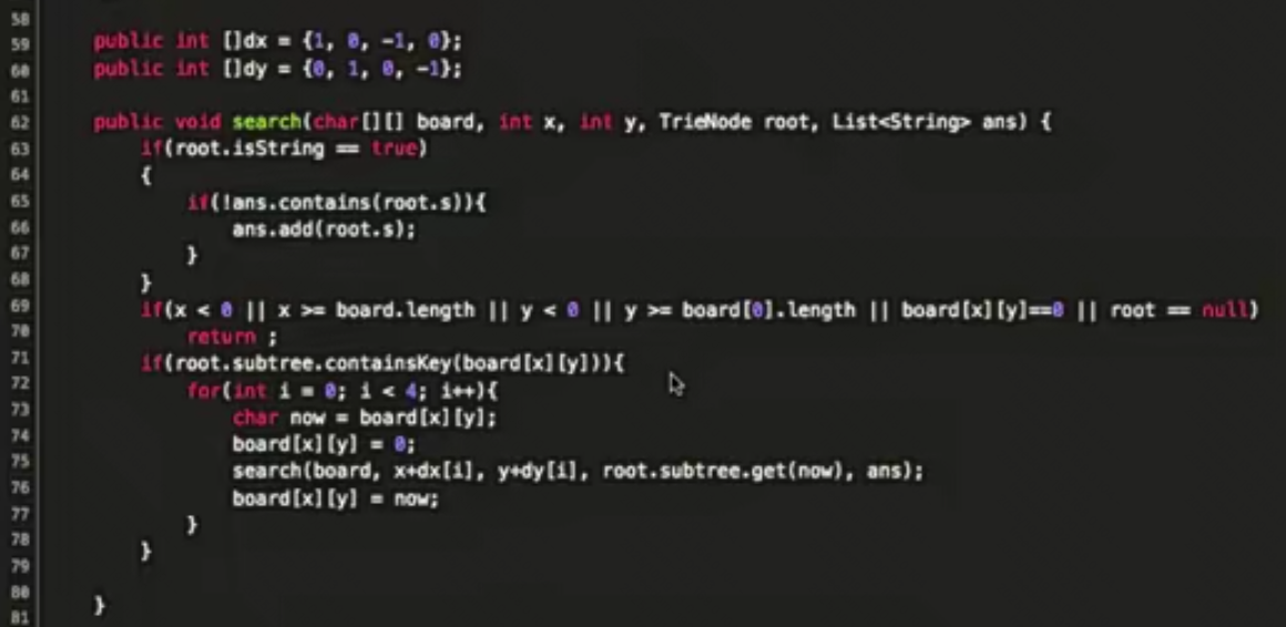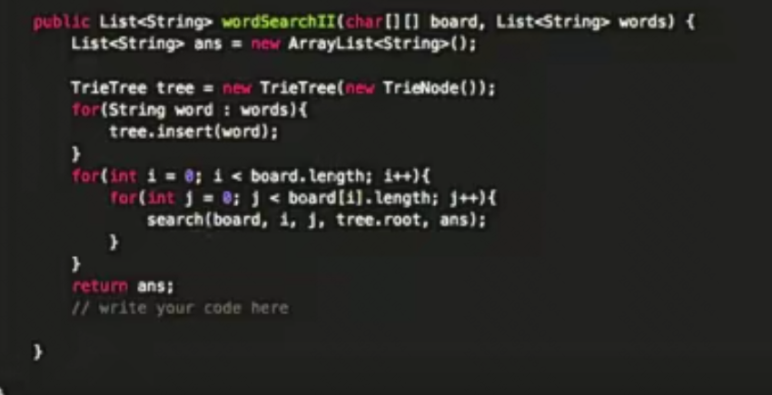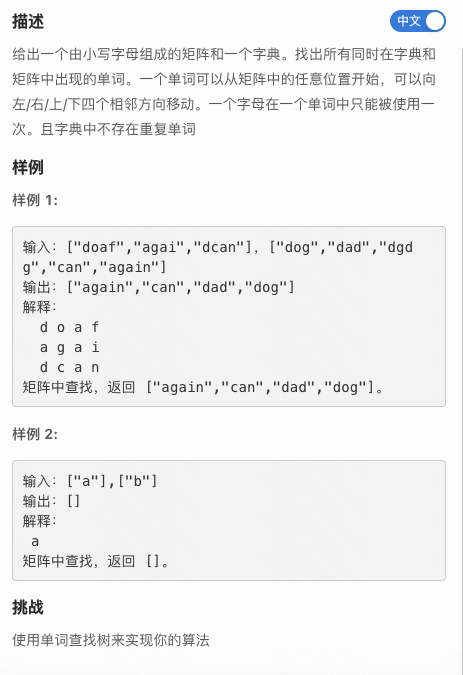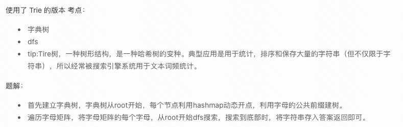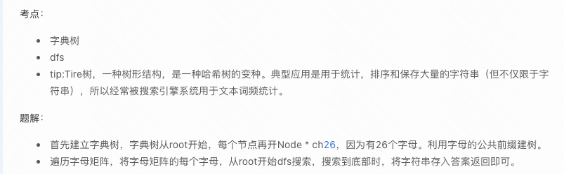 };public class Solution {/*** @param board: A list of lists of character* @param words: A list of string* @return: A list of string*/public int[] dx = {1, 0, -1, 0}; //搜索方向public int[] dy = {0, 1, 0, -1};public void search(char[][] board, //在字典树上dfs查找int x,int y,TrieNode root,List<String> results) {if (!root.children.containsKey(board[x][y])) {return;}TrieNode child = root.children.get(board[x][y]);if (child.word != null) { //如果访问到字典树叶子,将字符串压入result即可if (!results.contains(child.word)) {results.add(child.word);}}char tmp = board[x][y];board[x][y] = 0; // mark board[x][y] as usedfor (int i = 0; i < 4; i++) { //向四个方向dfs搜索if (!isValid(board, x + dx[i], y + dy[i])) {continue;}search(board, x + dx[i], y + dy[i], child, results);}board[x][y] = tmp; // revert the mark}private boolean isValid(char[][] board, int x, int y) { //检测搜索位置合法if (x < 0 || x >= board.length || y < 0 || y >= board[0].length) {return false;}return board[x][y] != 0;}public List<String> wordSearchII(char[][] board, List<String> words) {List<String> results = new ArrayList<String>();TrieTree tree = new TrieTree(new TrieNode());for (String word : words){tree.insert(word);}for (int i = 0; i < board.length; i++) { //遍历字母矩阵,将每个字母作为单词首字母开始搜索for (int j = 0; j < board[i].length; j++) {search(board, i, j, tree.root, results);}}return results;}