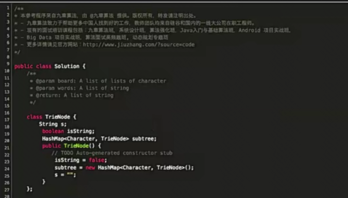 class TrieNode { //定义字典树的节点String word;HashMap<Character, TrieNode> children; //使用HashMap动态开节点public TrieNode() {word = null;children = new HashMap<Character, TrieNode>();}