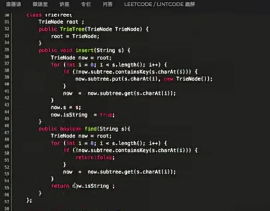 };class TrieTree{TrieNode root;public TrieTree(TrieNode TrieNode) {root = TrieNode;}public void insert(String word) { //字典树插入单词TrieNode node = root;for (int i = 0; i < word.length(); i++) { if (!node.children.containsKey(word.charAt(i))) {node.children.put(word.charAt(i), new TrieNode());}node = node.children.get(word.charAt(i));}node.word = word;}
