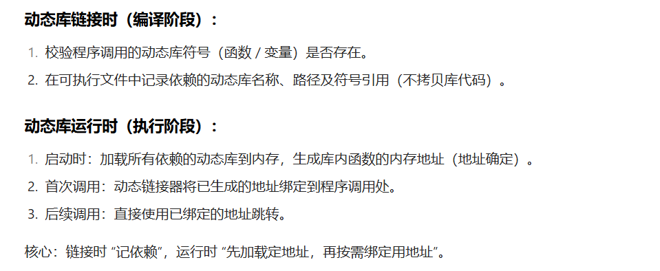 - 定义:编译链接时仅记录库引用,程序运行时由运行时链接器加载库。