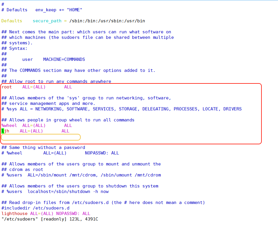 由于sudoers文件的拥有者是root所以得使用root用户添加,切换root账号,打开ect目录下的sudoers文件,在图片黄色格子圈的地方,按上述示例添加你的用户