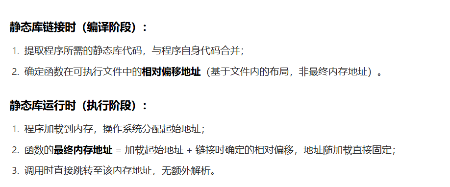 。 - 特点:生成的可执行文件体积大,但运行时不依赖外部库,可独立运行。例如,若程序链接了静态数学库,编译后库代码直接 “打包” 进程序,在无对应库的环境中也能运行。