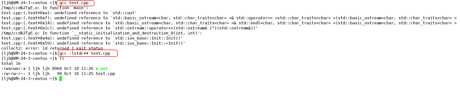 第一次编译失败是因为没有链接到C++的库,第二次加入-lstdc++选项才链接成功