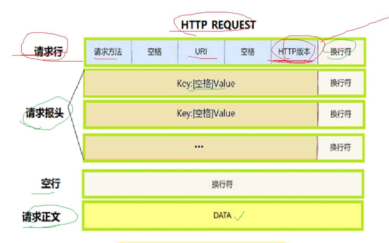 请求格式包含请求方法,url,http版本,请求报头,以及正文;其中元素之间用空格和换行符隔开,用于区分不同元素,用于解决粘包问题。