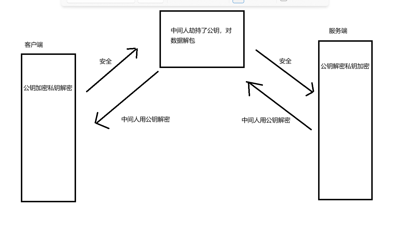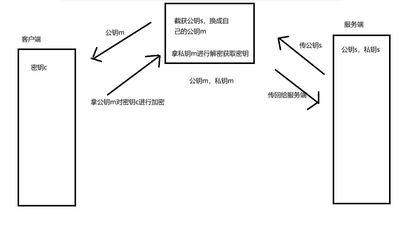 若中间人截取了服务端的公钥,将自己伪装的公钥m传给客户端,客户端用m进行加密后传给服务端时,中间人用私钥m进行解密,这样就获得了客户端的密钥。所以这样也是不安全的