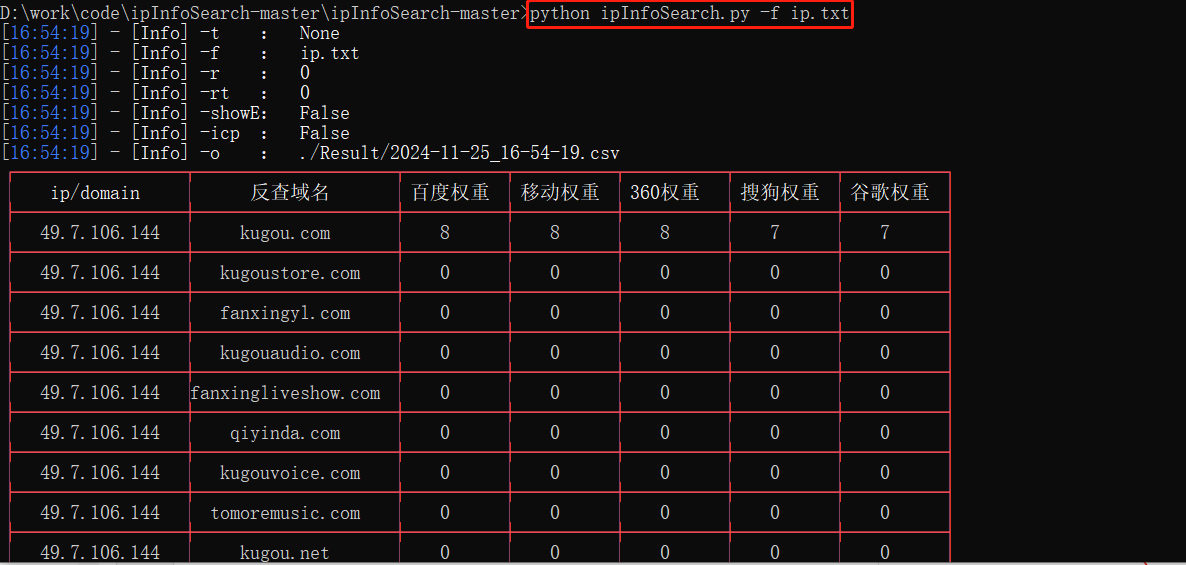 工具运行完成之后,会在终端输出ip反查域名的结果信息,如下图所示:python ipInfoSearch.py -f ip.txt