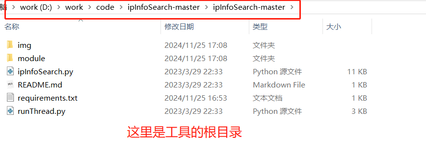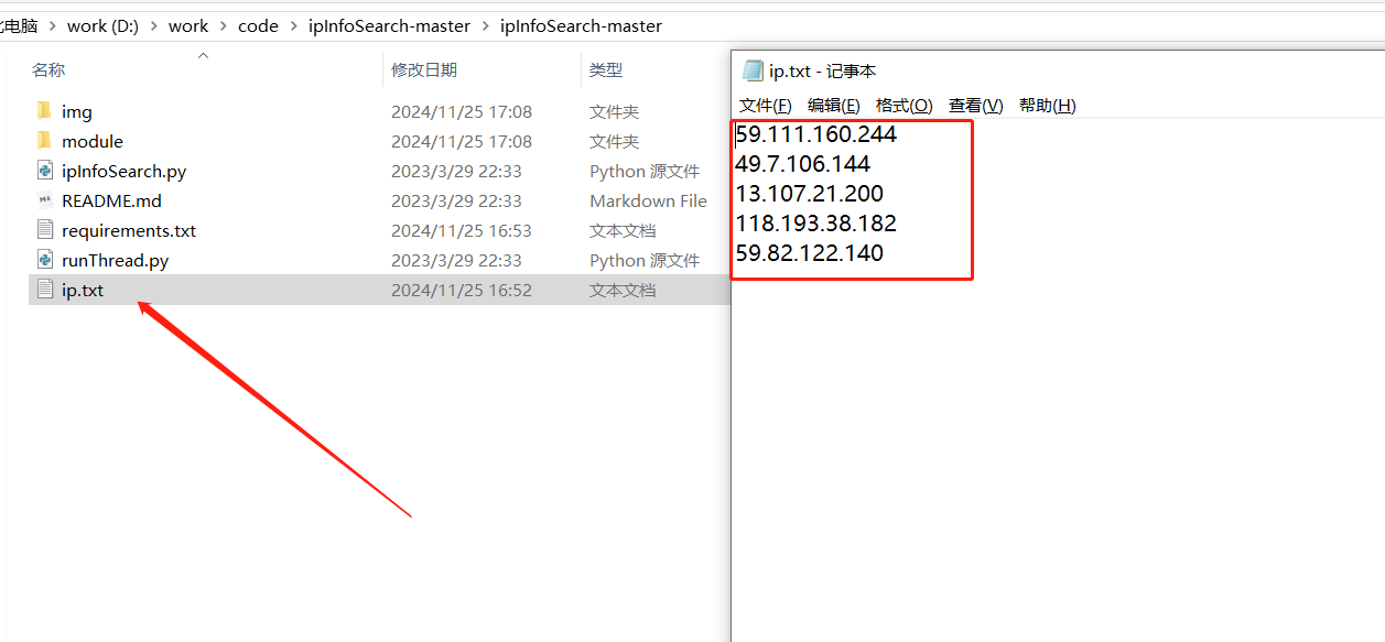 - 在工具的根目录下创建一个名为ip.txt的文件,然后在这个文件中写入你要查询的ip,一行一个,然后保存文件,如下图所示