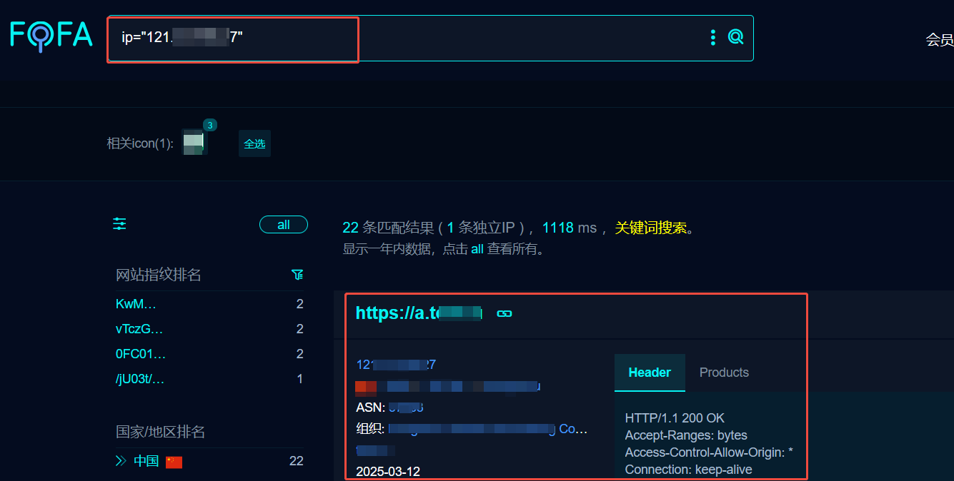 使用fofa查询指定ip的资产,在结果中可以找到同一资产的域名信息,如下图所示