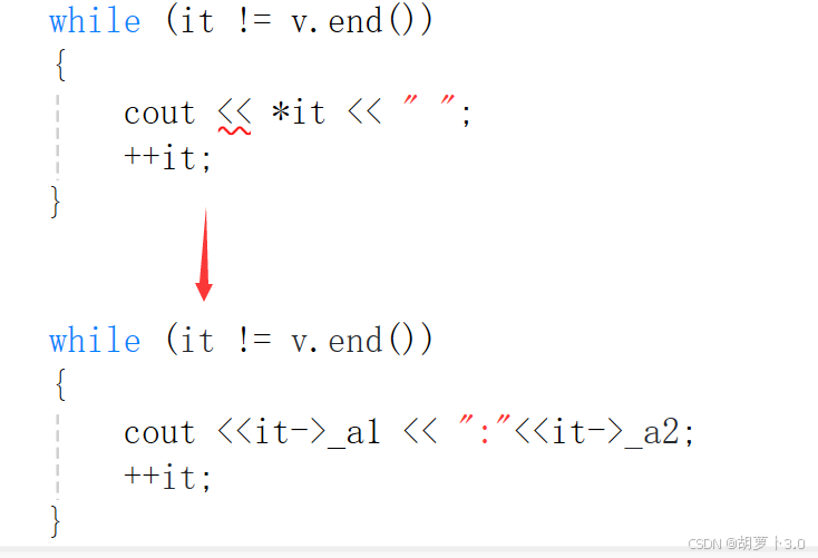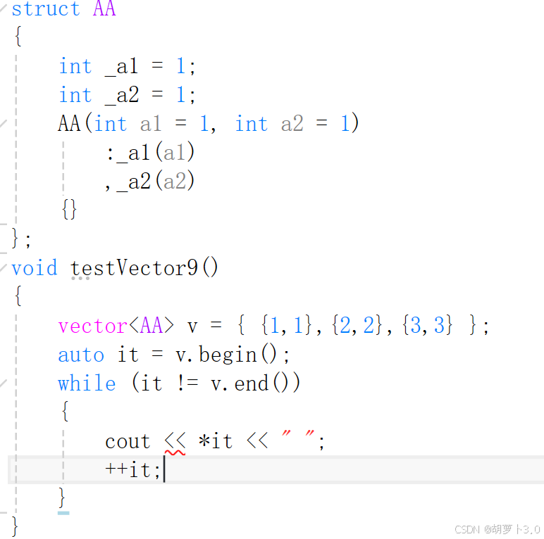 {vector<int> v({ 1,2,3,4,5,6,7,8,9,10 });auto it = v.begin();//指向开头数据的迭代器,也就是指向v[0]while (it != v.end())//end()是指向最后一个数据的下一个位置的迭代器{cout << *it << " ";++it;}}