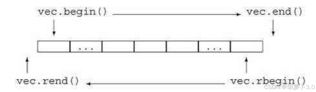 {vector<int> v({ 1,2,3,4,5,6,7,8,9,10 });auto it2 = v.rbegin();//指向最后一个数据的迭代器,也就是指向v[9]while (it2 != v.rend())//rend()是指向开头数据的上一个位置的迭代器{cout << *it2 << " ";++it2;}