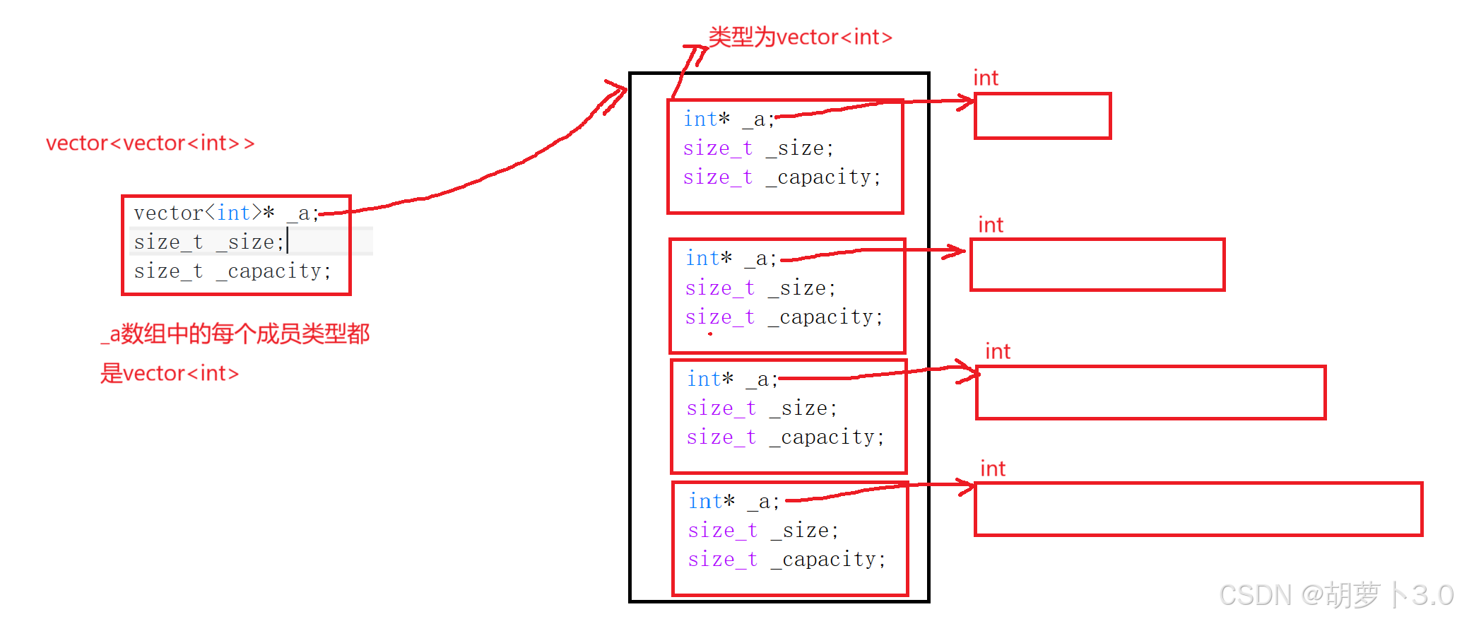 用vector<vector<int>>实例化出的对象中的数组中的成员类型都是vector<int>,vector<int>实例化出的对象中的数组是一个成员类型都是int的数组。