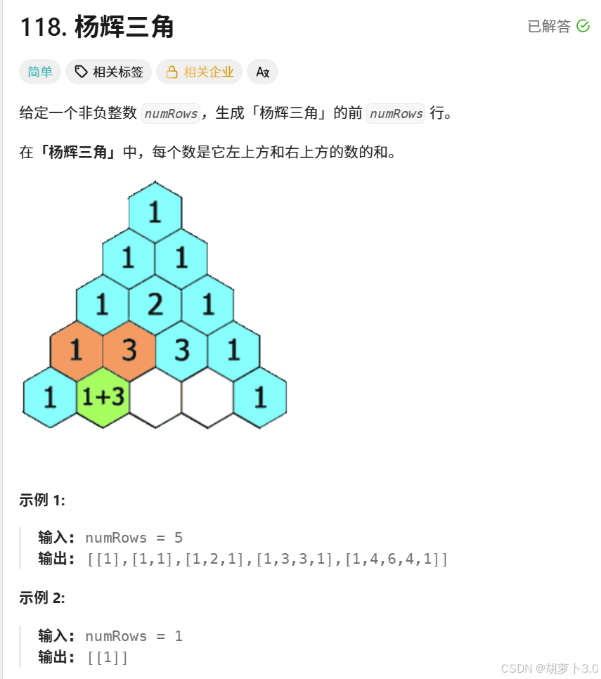 public:vector<vector<int>> generate(int numRows) {//创建一个vector<vector<int>>对象vector<vector<int>> vv;//行,匿名对象初始化vv.resize(numRows,vector<int>());//列for(size_t i=0;i<numRows;i++){vv[i].resize(i+1,1);}for(size_t i=2;i<vv.size();i++){for(size_t j=1;j<vv[i].size()-1;++j){vv[i][j]=vv[i-1][j-1]+vv[i-1][j];}}return vv;}