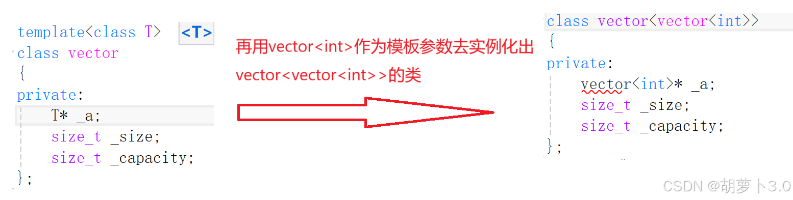 - 再用vector<int>作为模板参数去实例化出vector<vector<int>>的类