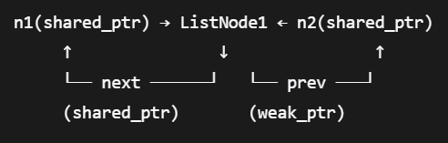 struct ListNode {int data;std::shared_ptr<ListNode> next;std::weak_ptr<ListNode> prev; // 使用weak_ptr打破循环~ListNode() {std::cout << "~ListNode()" << std::endl;}