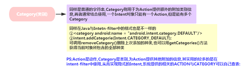 : 零个或多个,声明组件所属的类别。如果没有指定类别,则只响应没有类别的 Intent。但CATEGORY_DEFAULT