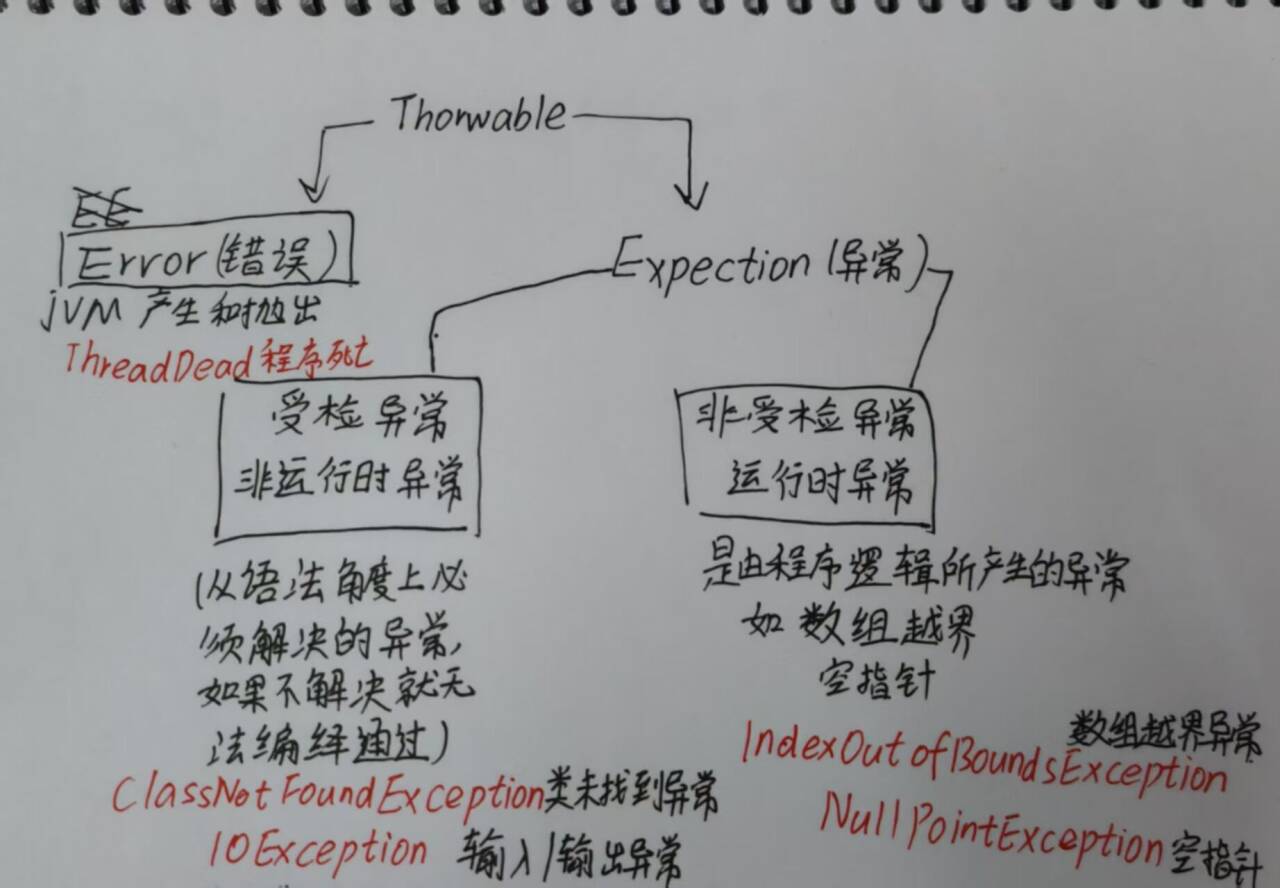 受检异常 :是指在编译时强制检查的异常,必须在代码中显式地处理或声明抛出。例如,IOException和SQLException就是已检查异常,由程序语法所产生的异常