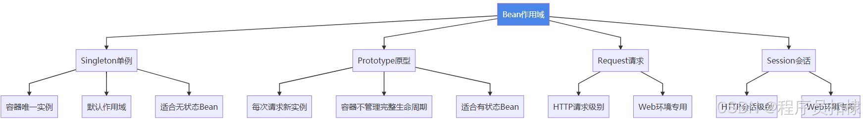 public class LifecycleBean implements BeanNameAware, BeanFactoryAware, ApplicationContextAware, InitializingBean, DisposableBean {private String beanName;// 1. 构造函数public LifecycleBean() {System.out.println("1. 构造函数执行");}// 2. BeanNameAware接口@Overridepublic void setBeanName(String name) {this.beanName = name;System.out.println("2. BeanNameAware: " + name);}// 3. BeanFactoryAware接口@Overridepublic void setBeanFactory(BeanFactory beanFactory) throws BeansException {System.out.println("3. BeanFactoryAware");}// 4. ApplicationContextAware接口@Overridepublic void setApplicationContext(ApplicationContext applicationContext) throws BeansException {System.out.println("4. ApplicationContextAware");}// 5. 属性注入后public void setSomeProperty(String value) {System.out.println("5. 属性注入: " + value);}// 6. InitializingBean接口@Overridepublic void afterPropertiesSet() throws Exception {System.out.println("6. InitializingBean.afterPropertiesSet");}// 7. 自定义init方法public void customInit() {System.out.println("7. 自定义init方法");}// 8. Bean就绪,可被使用// 9. DisposableBean接口@Overridepublic void destroy() throws Exception {System.out.println("9. DisposableBean.destroy");}// 10. 自定义destroy方法public void customDestroy() {System.out.println("10. 自定义destroy方法");}